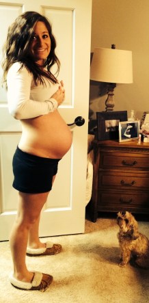 27 Weeks (March 28, 2014). Well, well, well. I’m definitely getting pretty darn big. It’s crazy… I don’t recognize my own body. But, I’m feeling great (pregnancy wise) and working to fight off this ick. Also, how cute is Toby? I swear I didn’t even call him. He just followed us into the room and sat down to watch me. So cute.