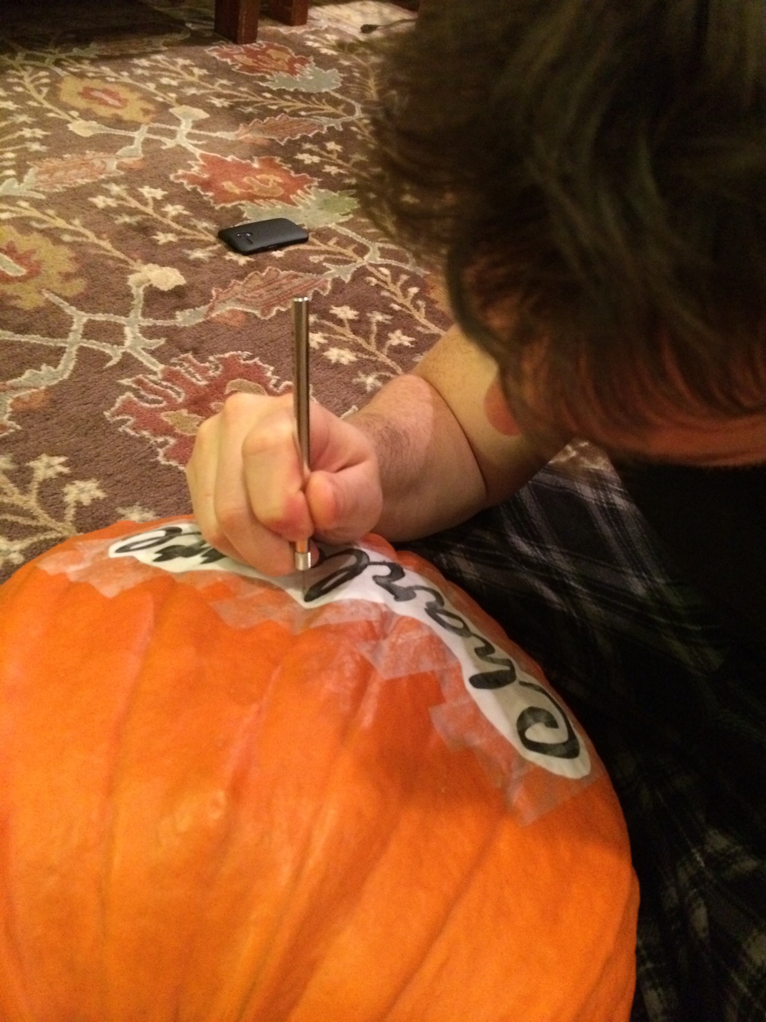Step three: use a very skinny exacto knife to trace your stencil onto the pumpkin. The best way is to poke holes until you’ve traced everything. Note: work from the inside out… The middle, the inside of a letter, everything.