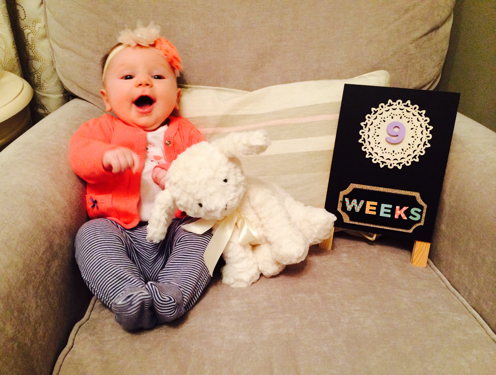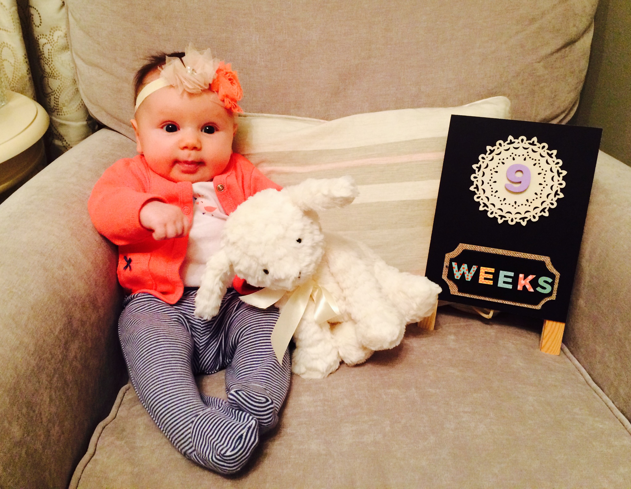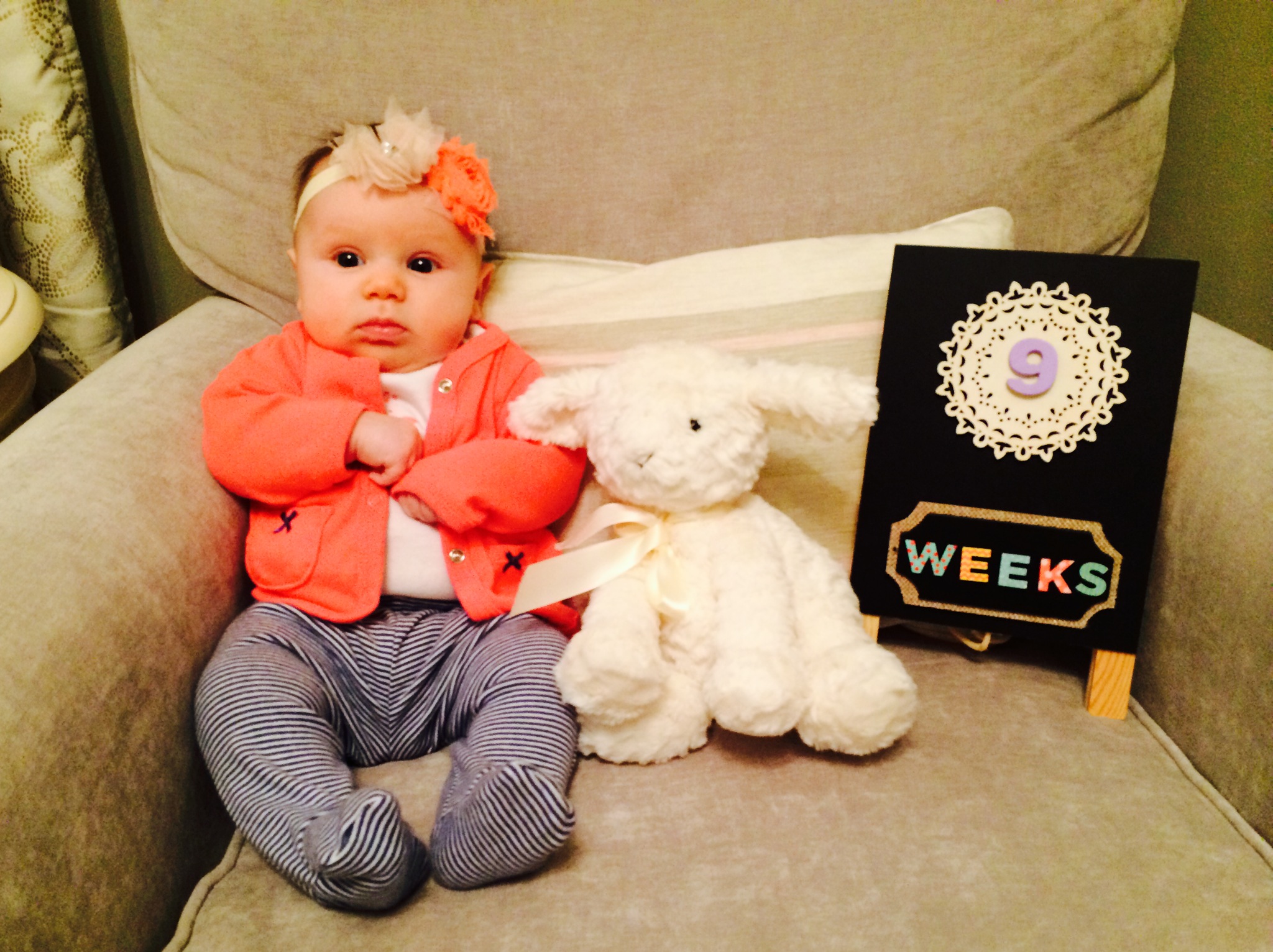 I mean, really! How have 9 weeks flown by already? It’s so crazy to see the changes. She went from this little cute and delicate and precious little eating/sleeping/pooping machine to this special and perfect little person. It’s so amazing to see her personality coming through. Oy. I just love her more than I could have ever imagined.