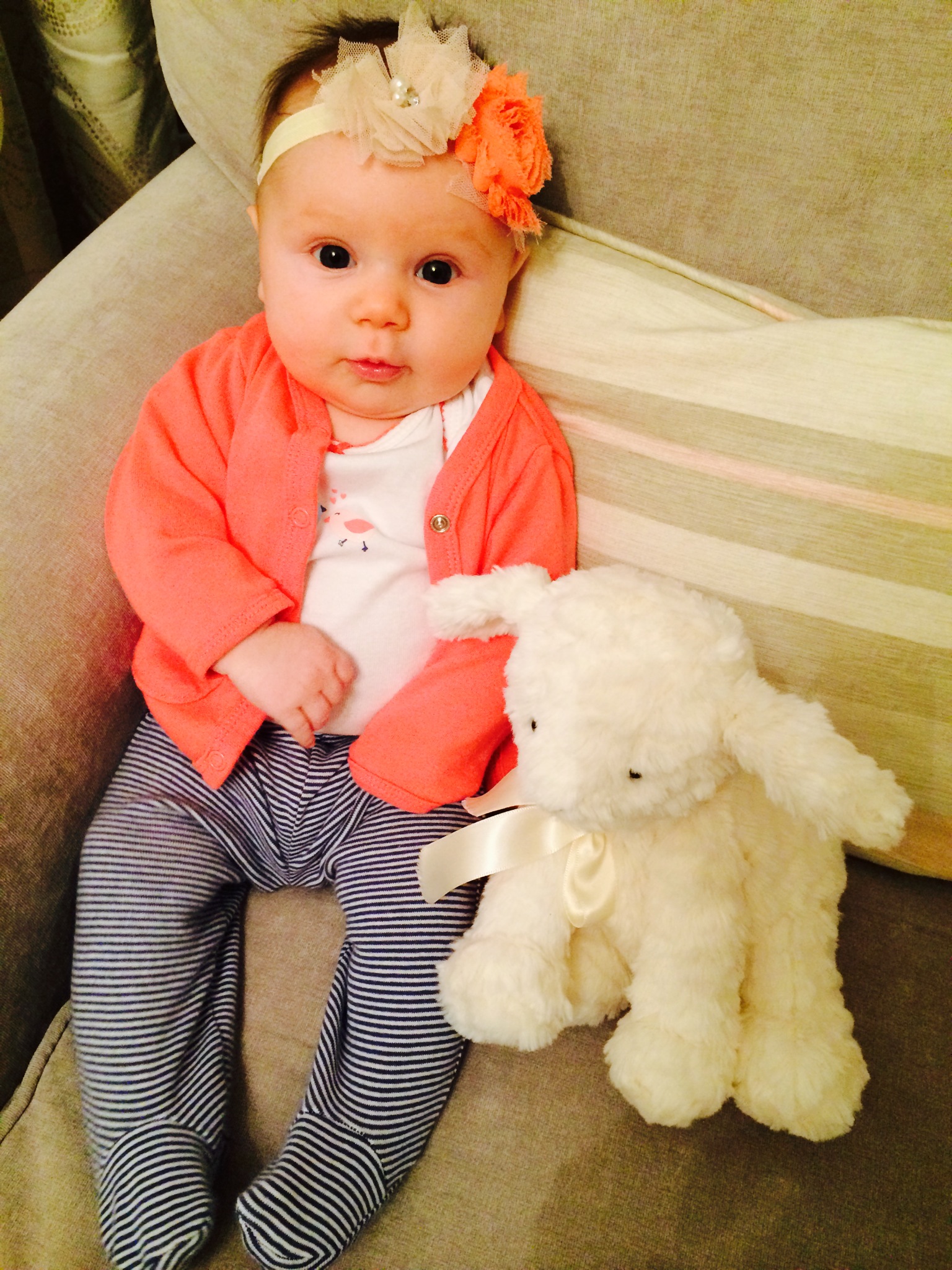 Besides just becoming more and more lovely, our girl has also started to get on a good schedule in the day. I was hoping to post about napping separately, but the short version is that sweetie pie is napping in her crib!! Yay! Other than that, she continues to get more and more neck strength and head control. She’s the smiliest thing ever. She’s becoming way more vocal and is an expert spit bubbler. Oh, and a master drooler.