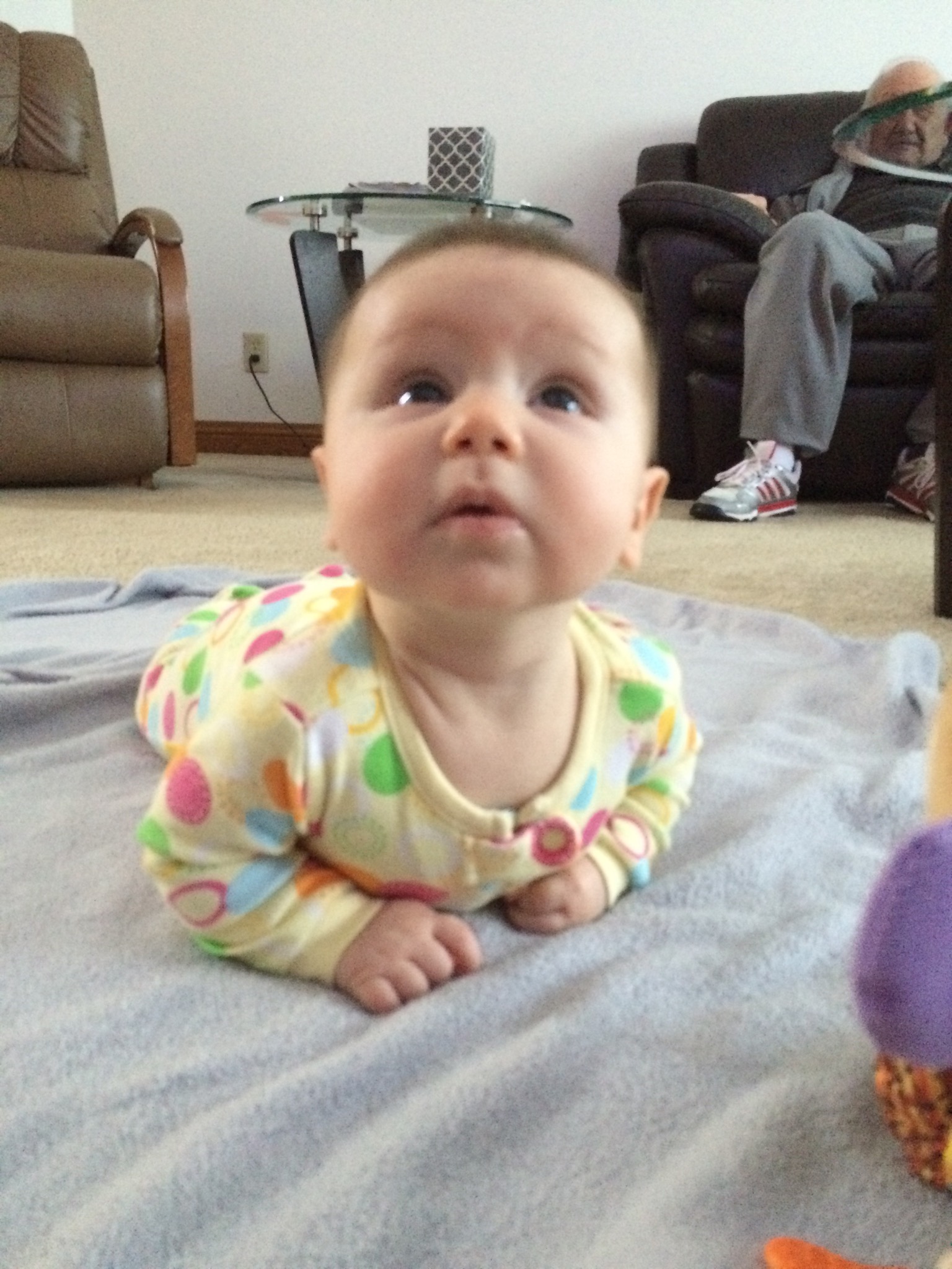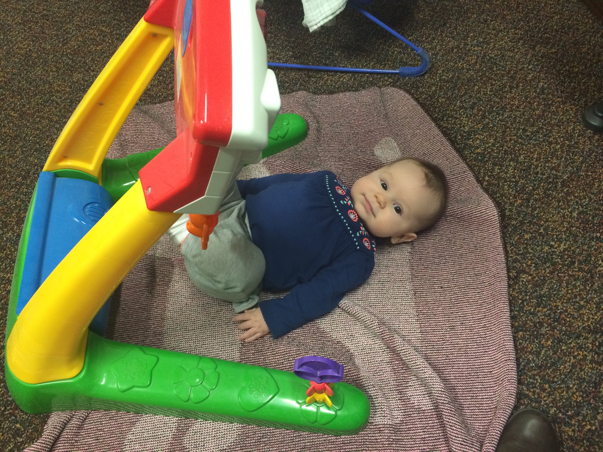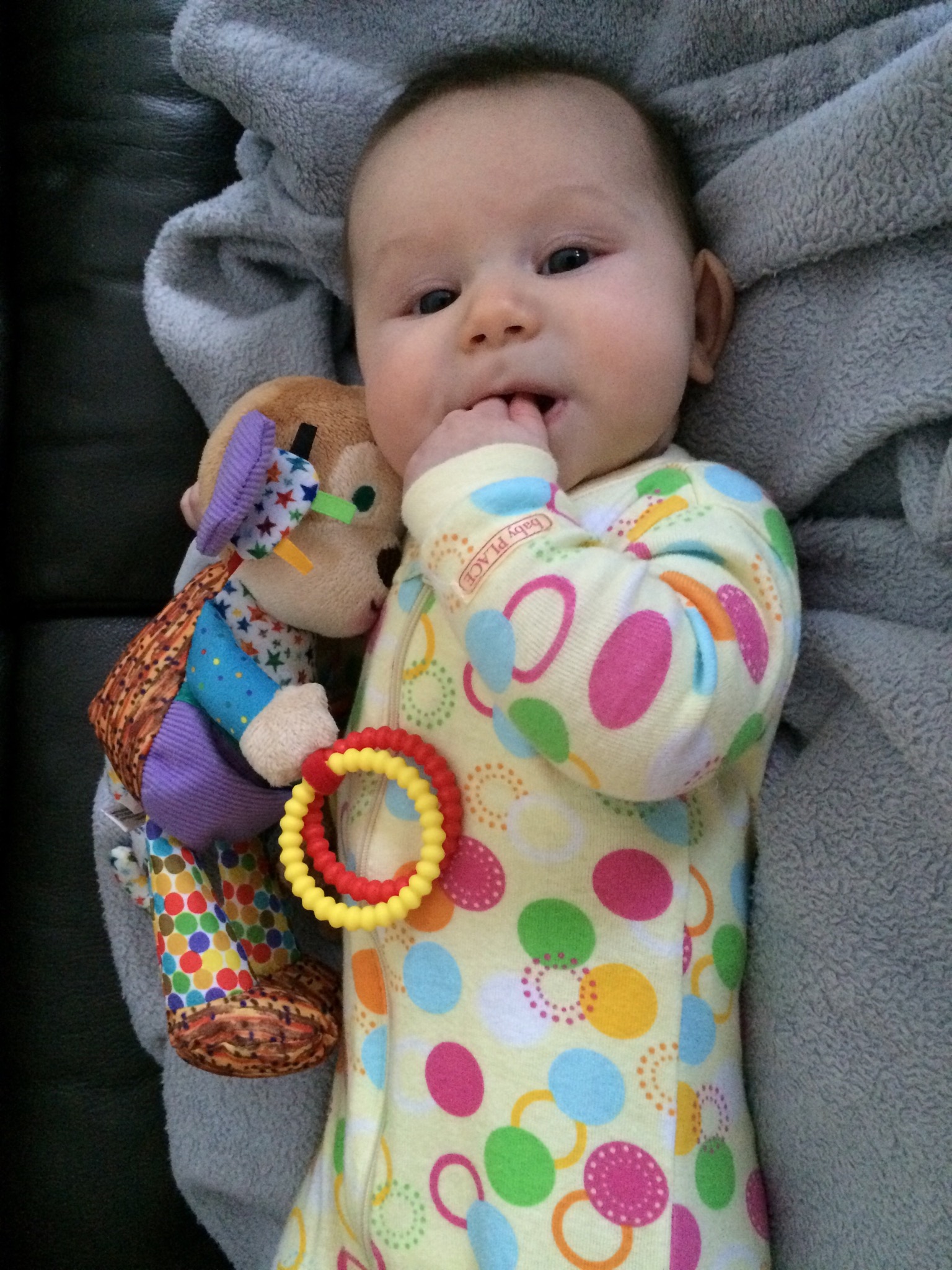 Other than that, she’s still loving her toys and getting so good at grabbing them. In fact, today she grabbed her wubanub (paci with a stuffed animal on it) and got it in her mouth twice! She was so proud. Unfortunately, with her pride came an excited swinging of her arms, which pulled the paci right out of her mouth.