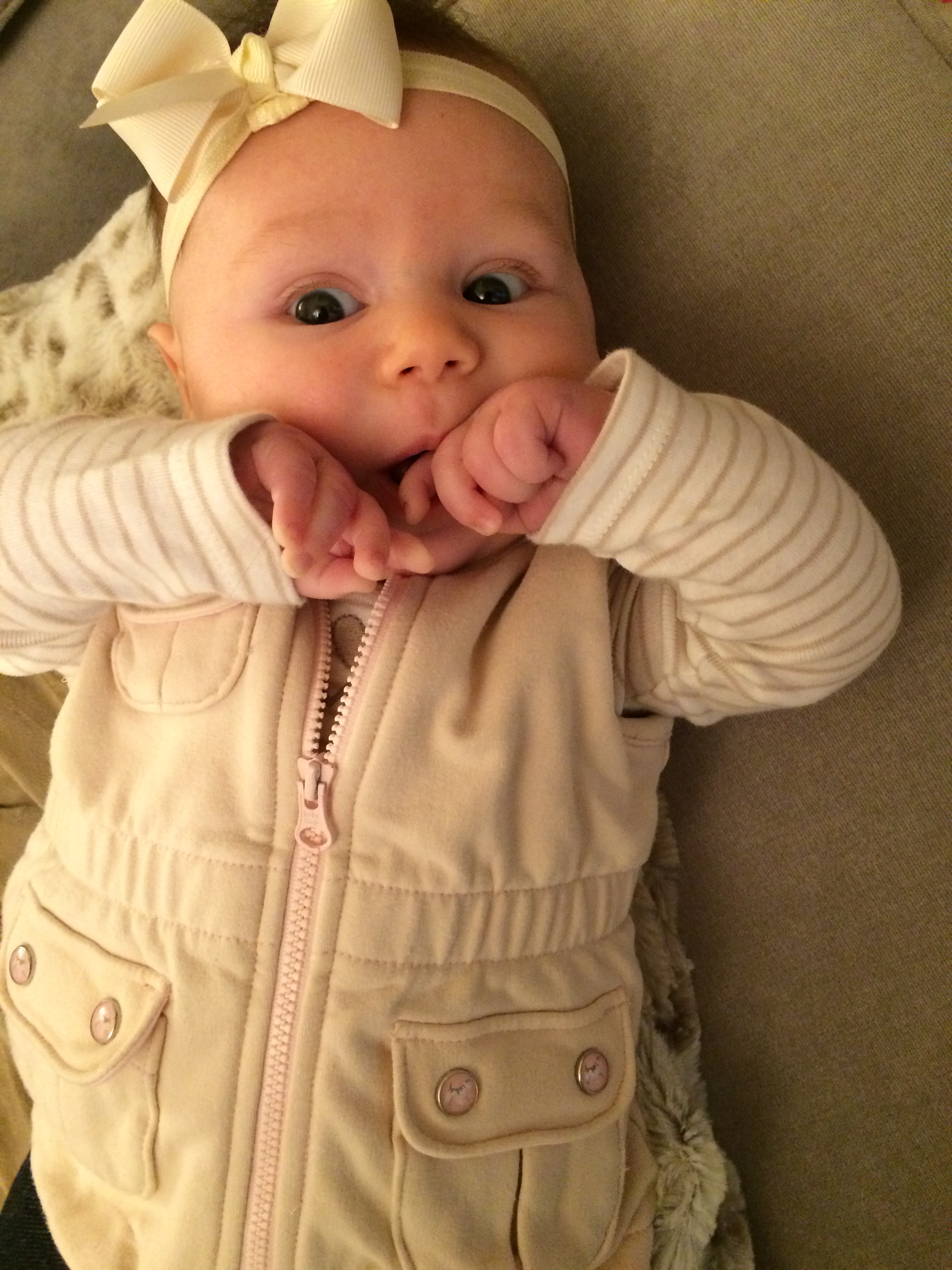 I know I keep saying this, but she’s SO close to laughing. She’ll let out 2-3 “ha’s” at a time, but they haven’t really turned over into a full on laugh quite yet. But, it’s coming. I just know it!
