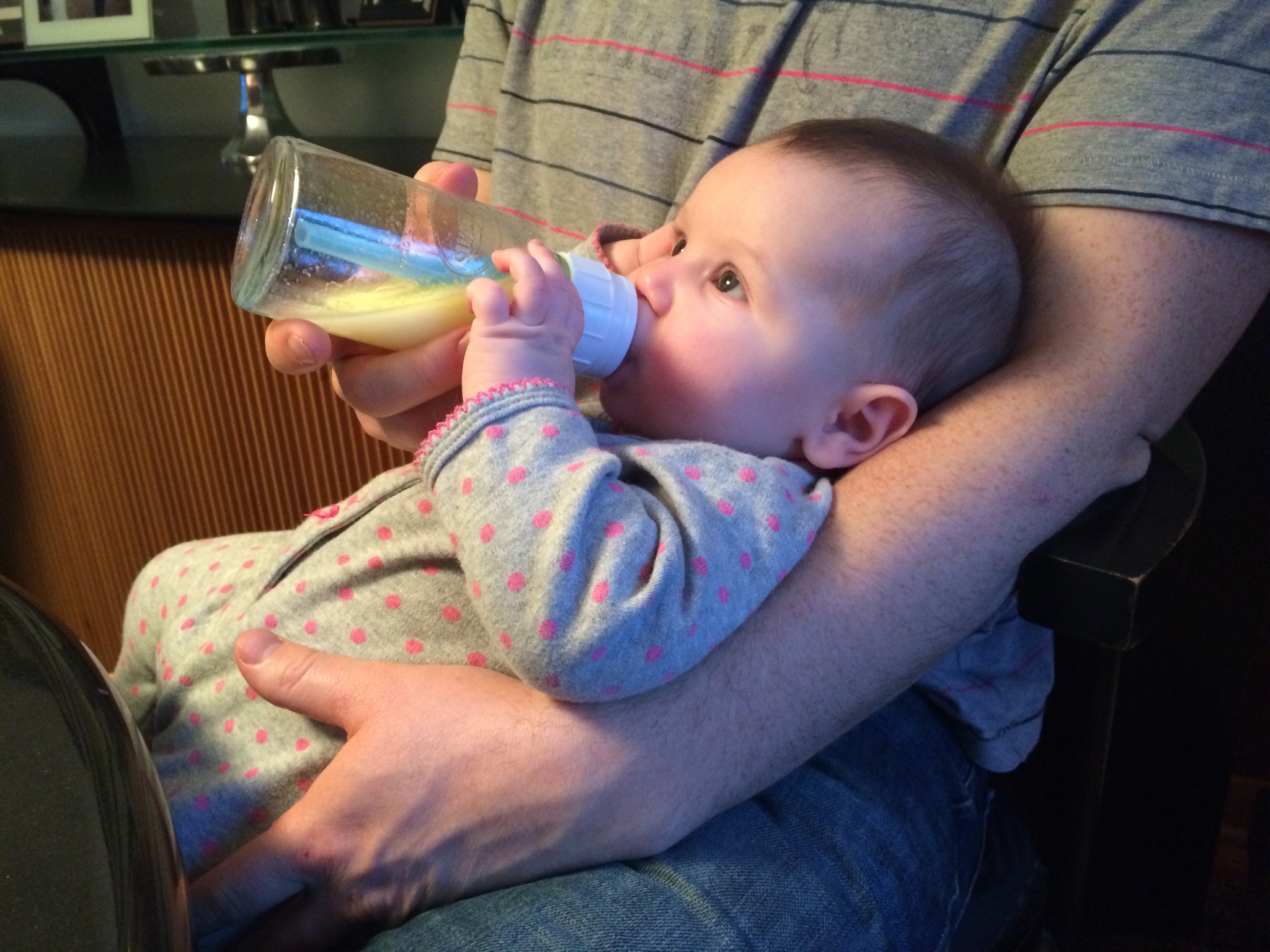 She’s still waking up 2 or 3 times per night to eat, which hubs and I switch off taking care of. He feeds her pumped milk from a bottle and I breastfeed her. She is warming up to the bottle, but still does not get as relaxed as she is on the breast.