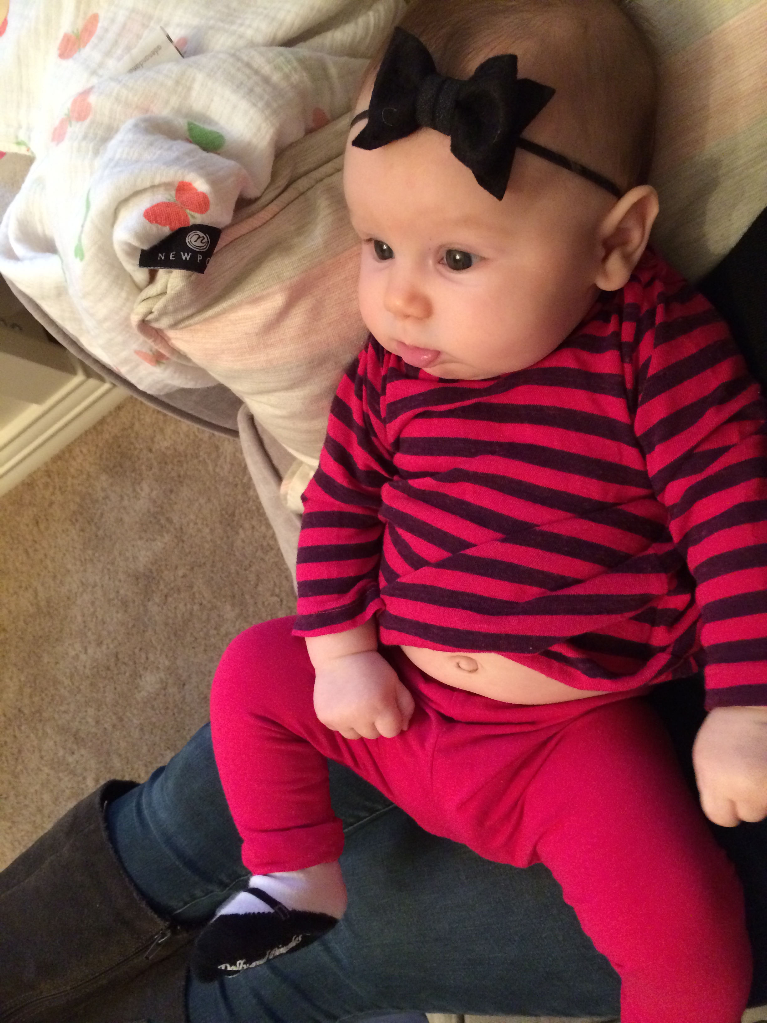 This little munchkin of ours is getting so big so fast. (She’s already in 3-6 months now… as of this week… although everything is a bit big on her.) It blows my mind. The lovely lady is still not sleeping through the night anymore, but is doing really well with her napping. At night, she’s up about twice a night… 11ish and 3 or 4ish. Not horrible. She is still boycotting a bottle, which is a pain in the butt… especially because this past weekend, I came home from the gym to find Mark trying to give her a bottle. He had been trying for 20ish minutes. I decided to try and give it a shot and sure enough, she took the bottle from me. Think she’s trying to tell us something?