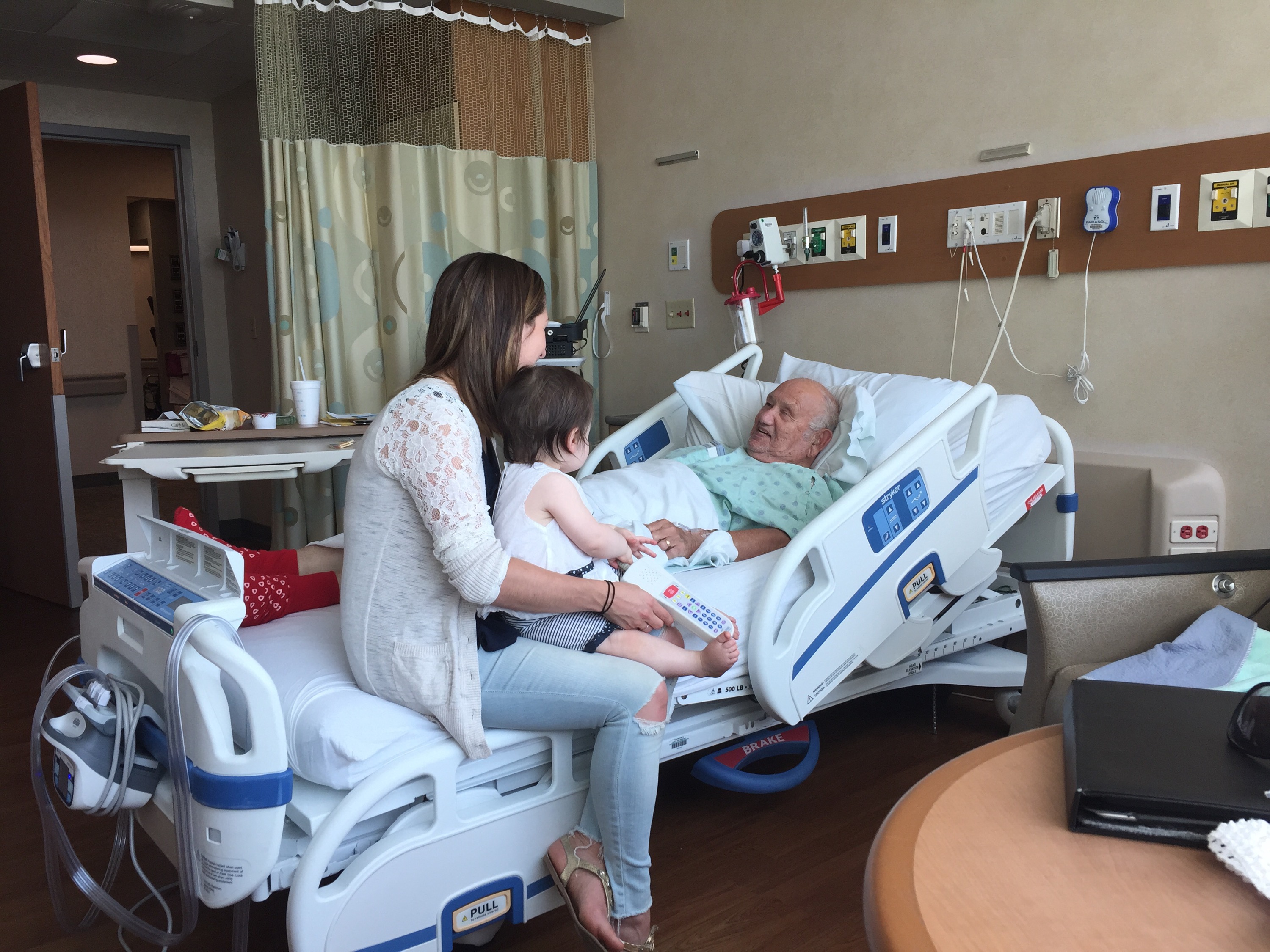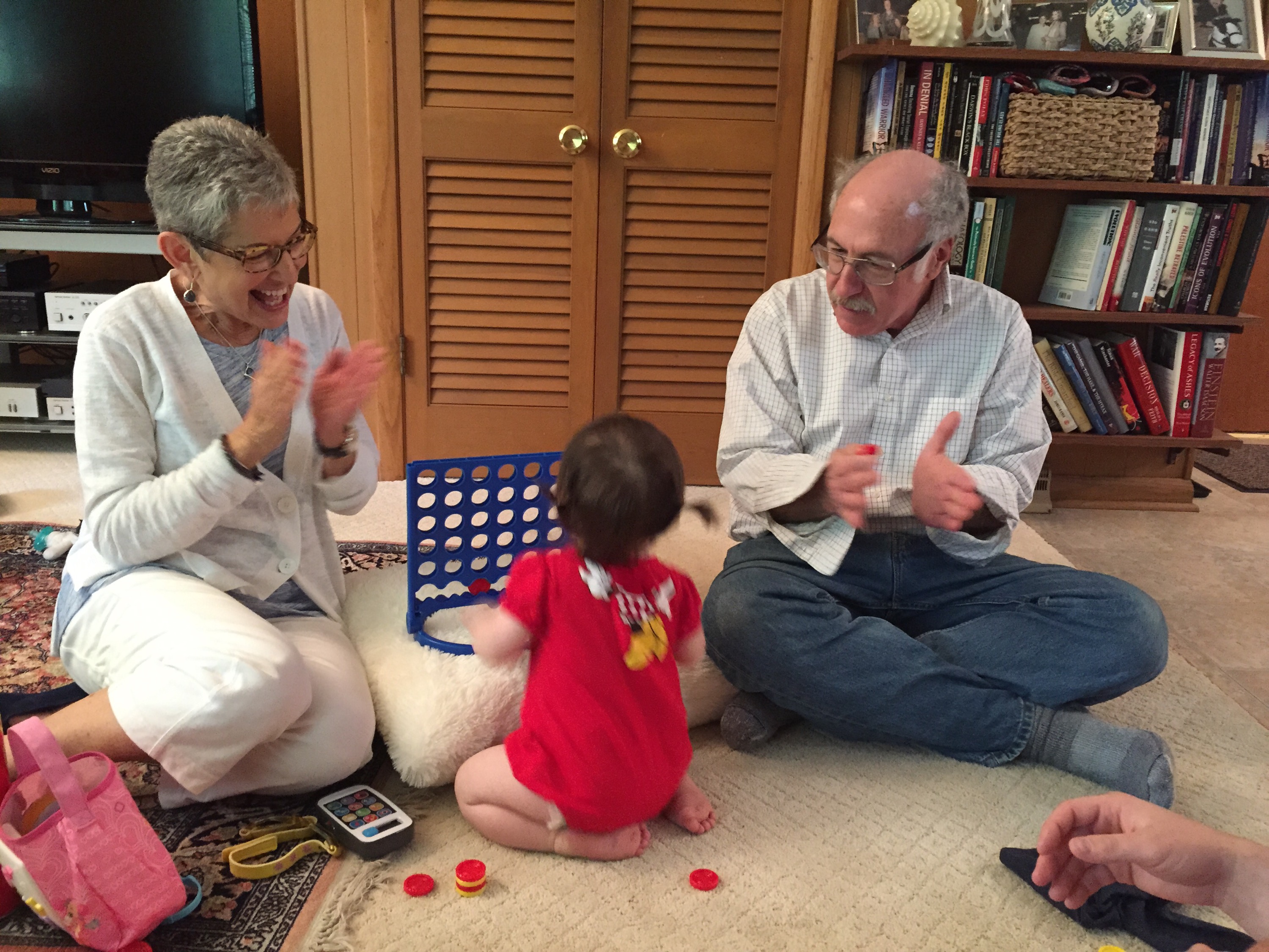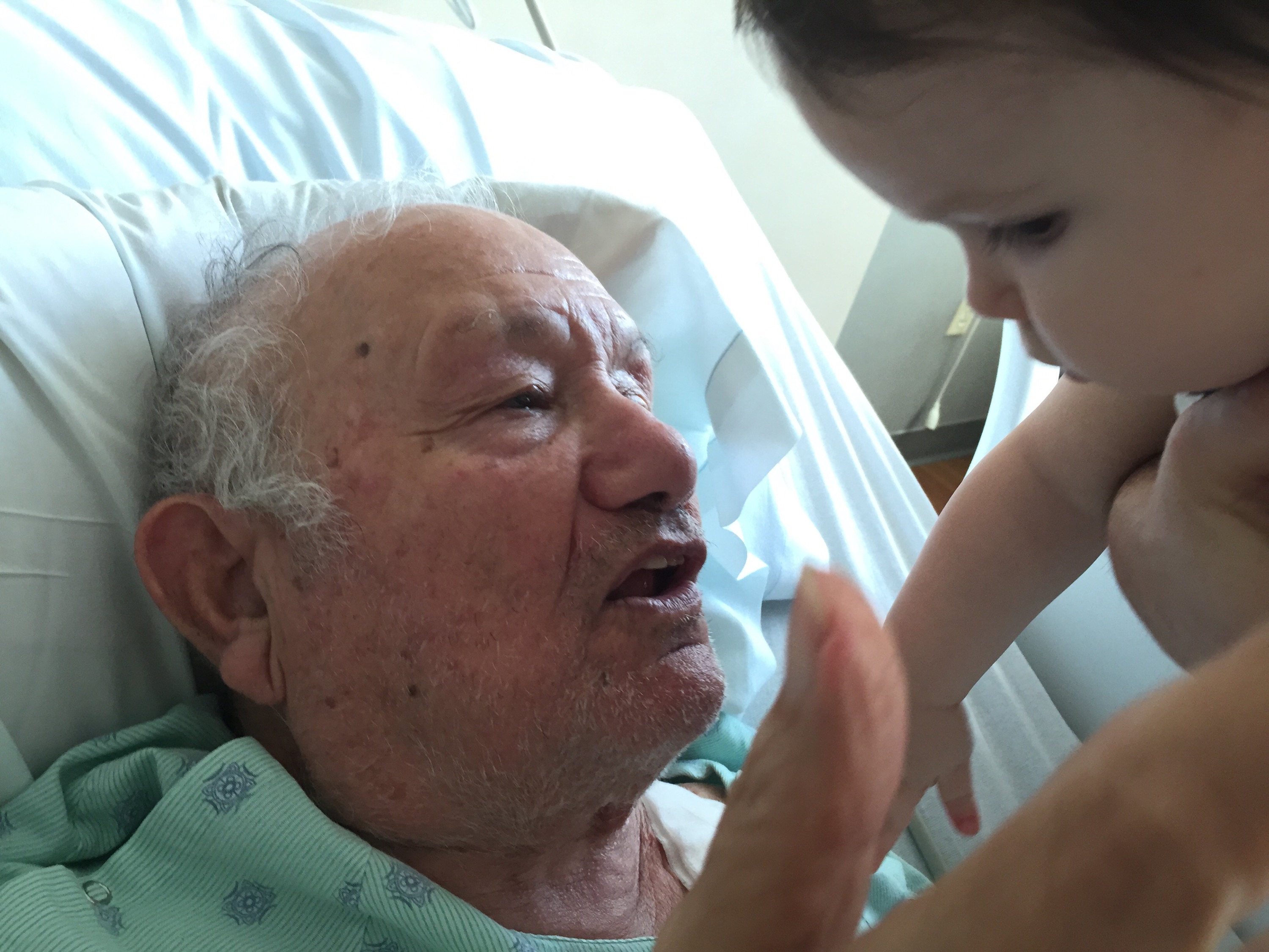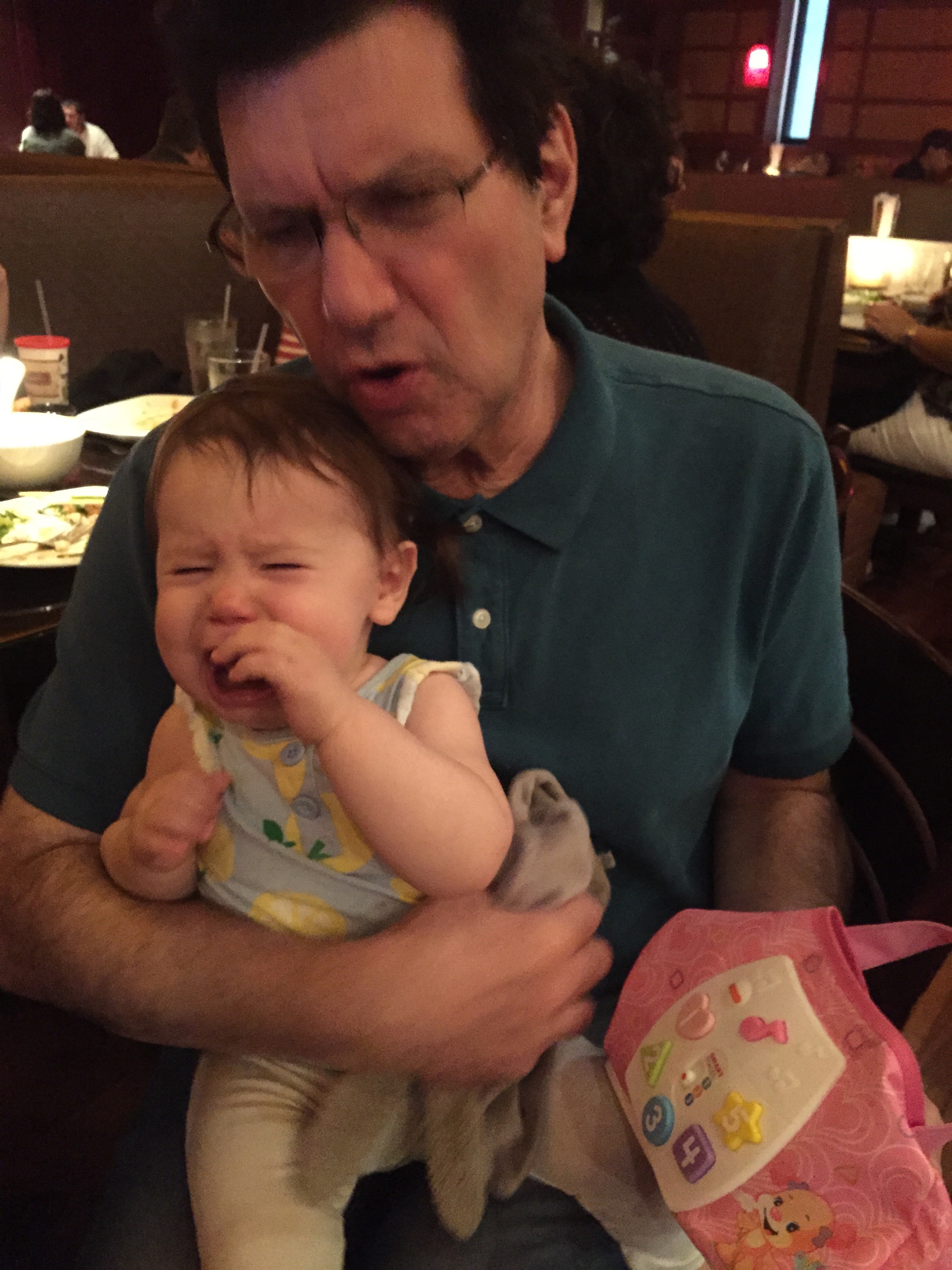 Charlie & Cousin Gabby snuggling with Grandpa at dinner