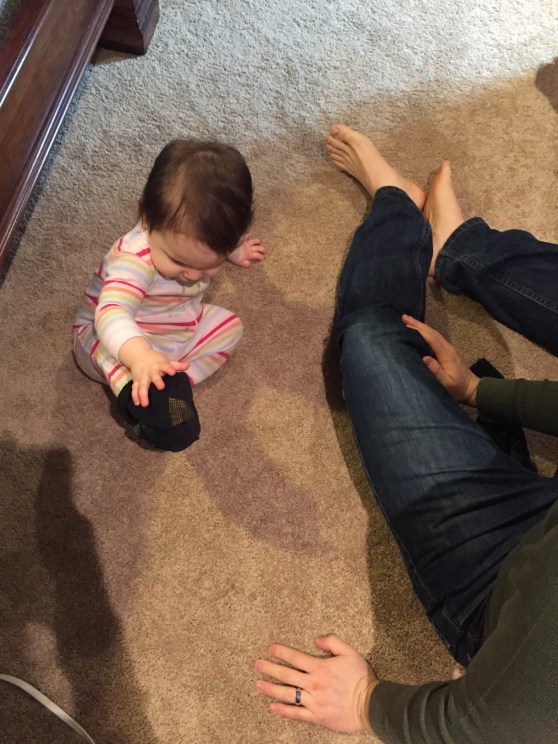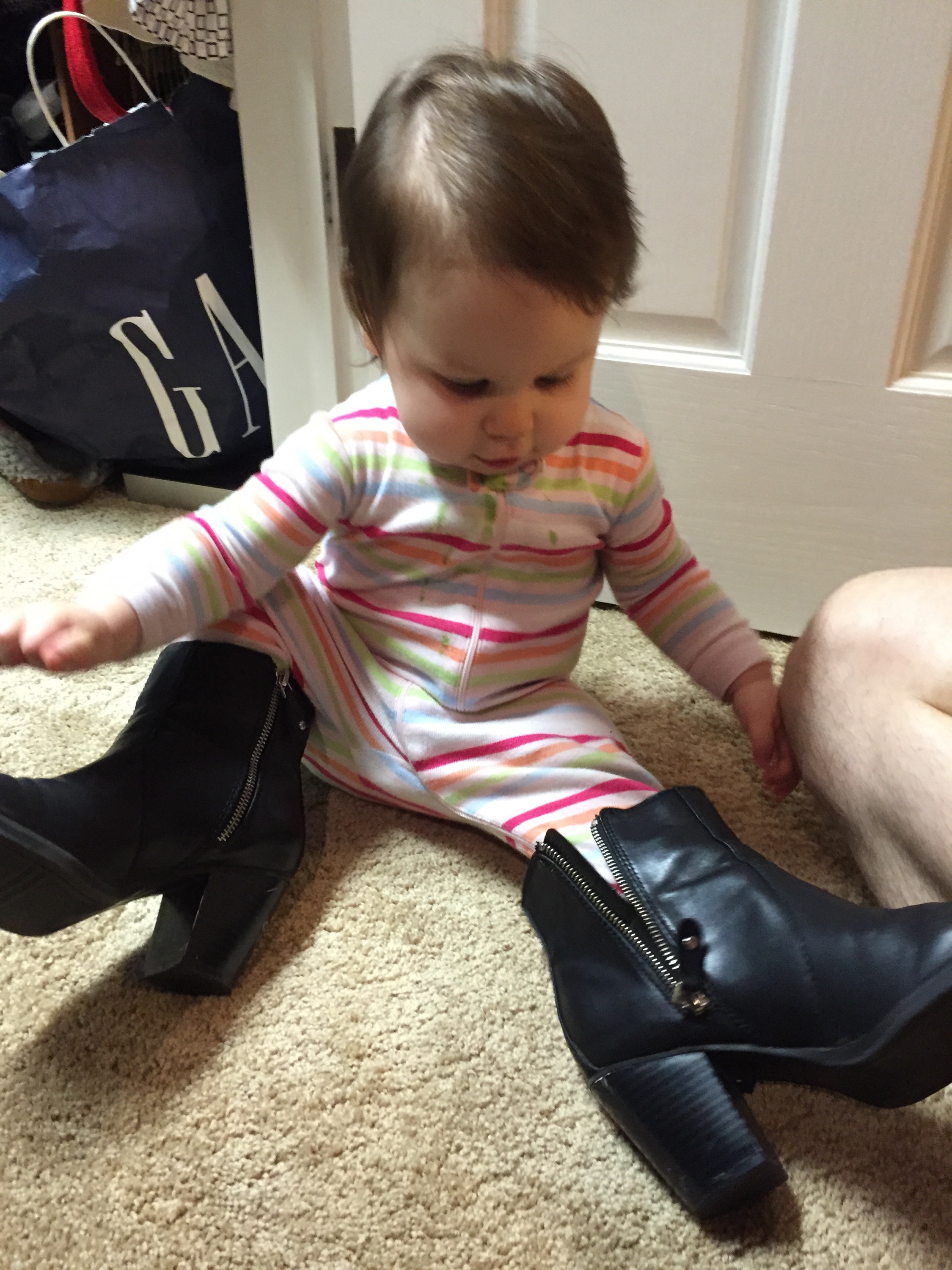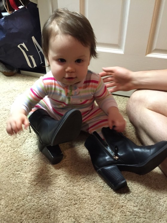 The other big one has been shoes. Whether it’s her shoes or someone else’s, the girl just wants to tote them around, put them on her feet and take them off.