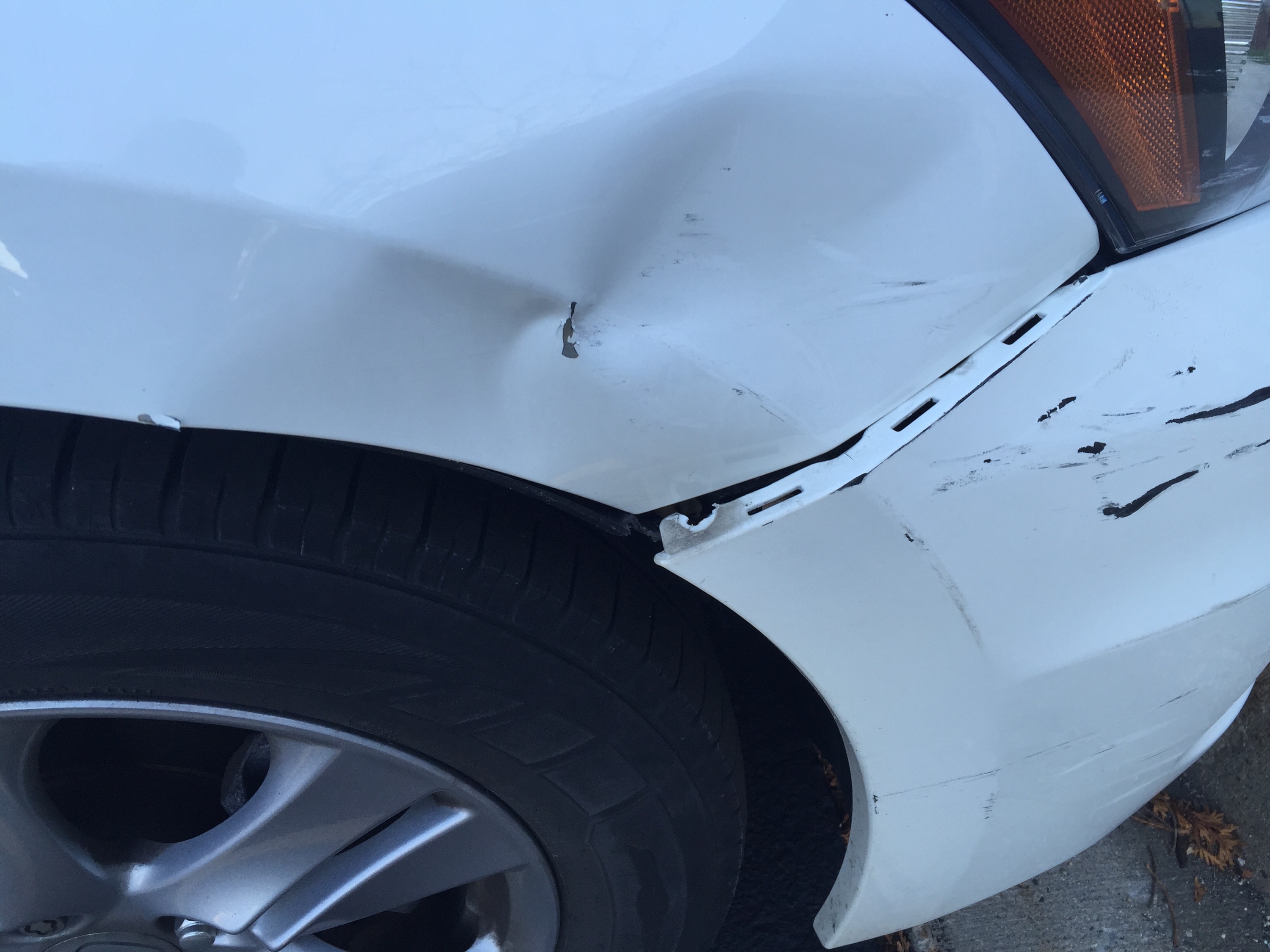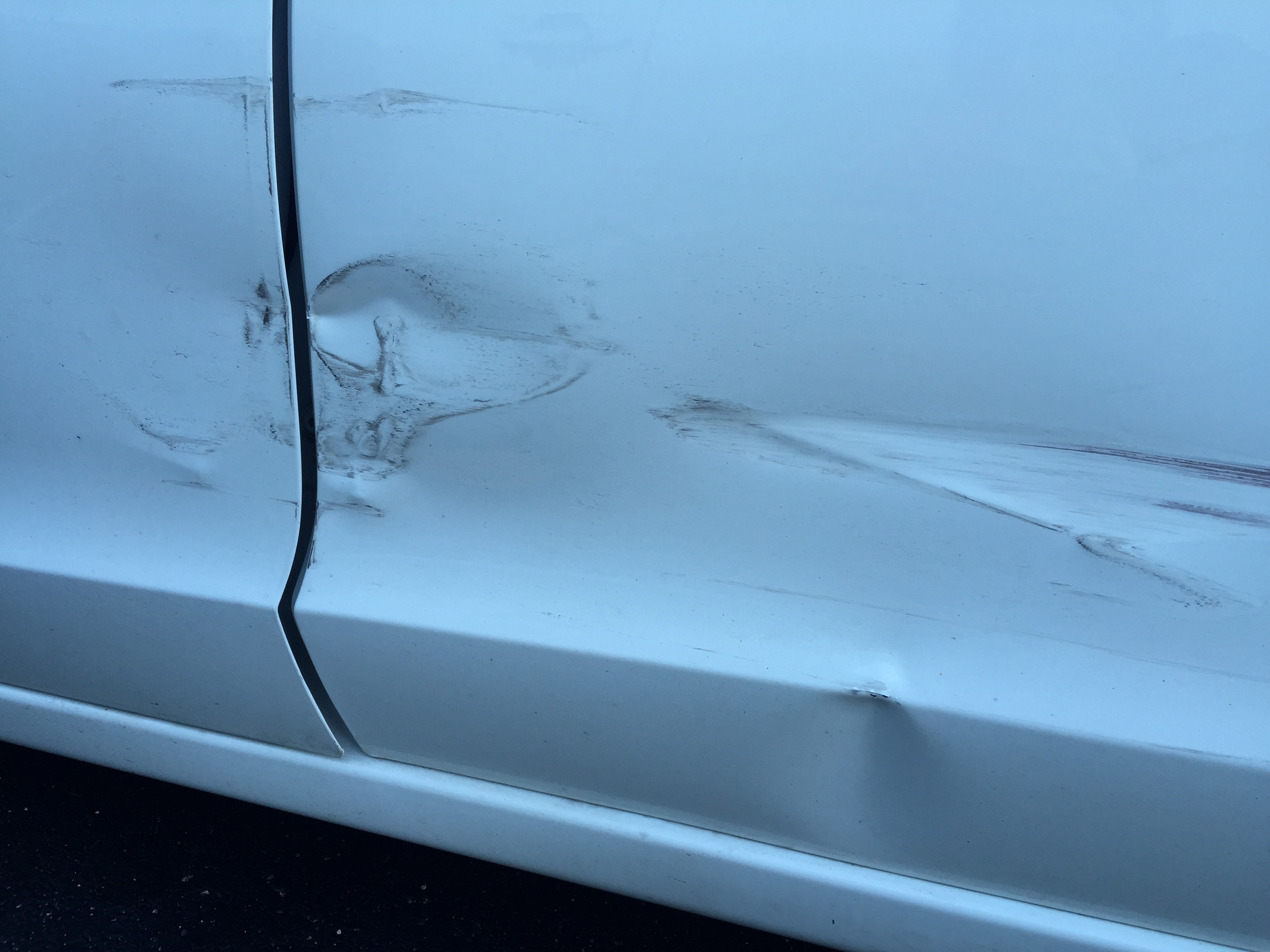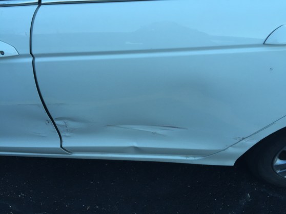 I was simply minding my own business, looking for a parking spot at the doctor’s office when BAM! Dude flew out of his parking space and bashed my car door (just a touch) and the back door (a lot).