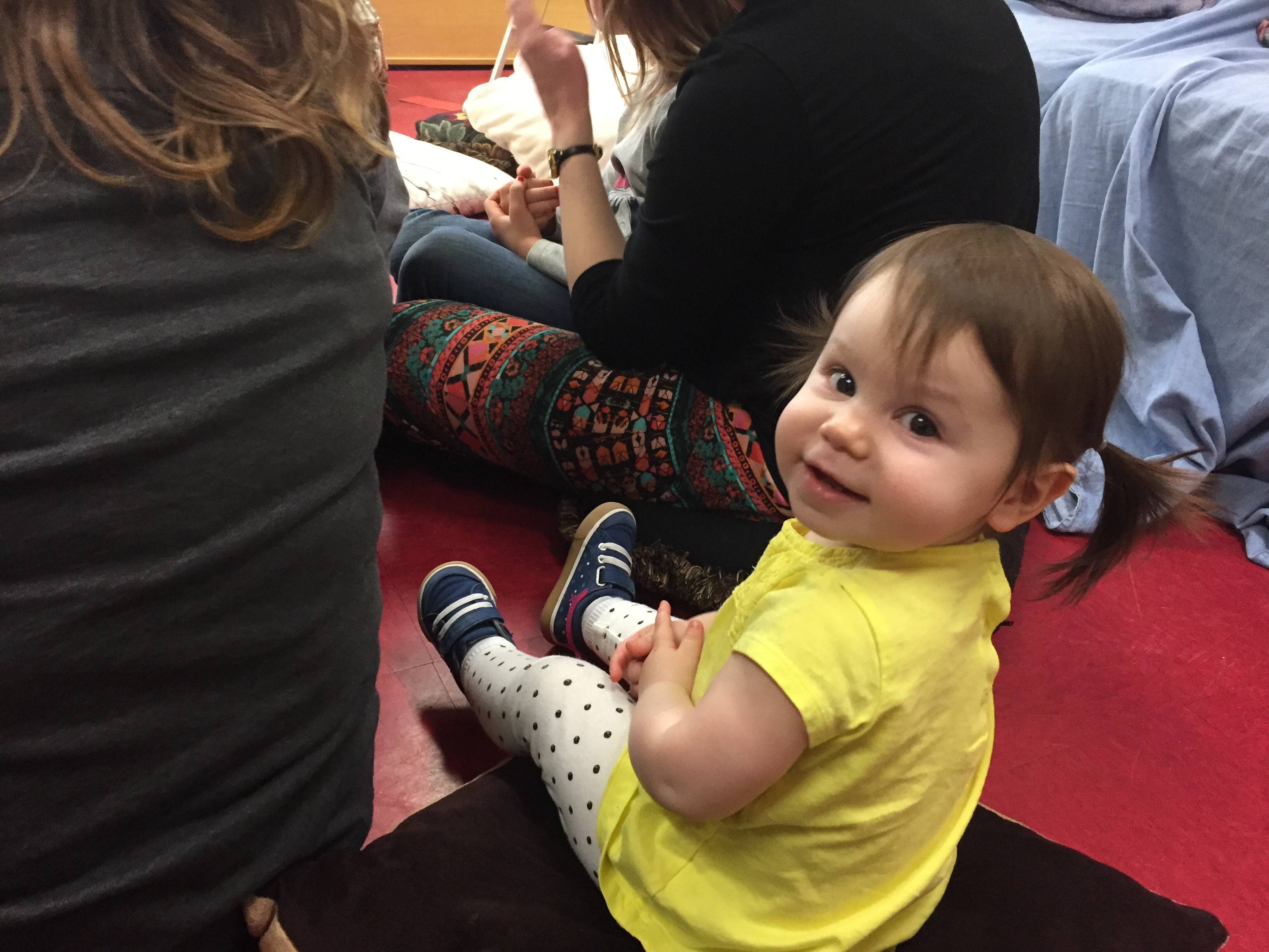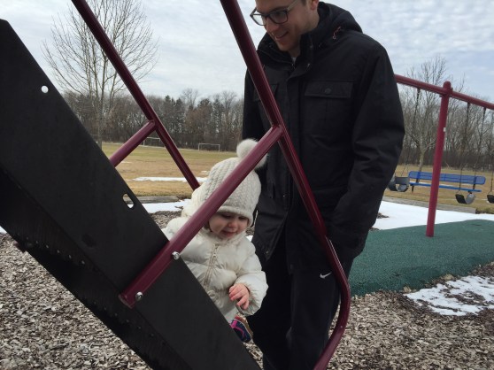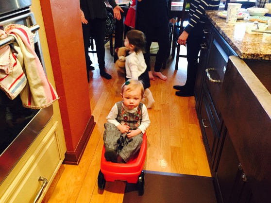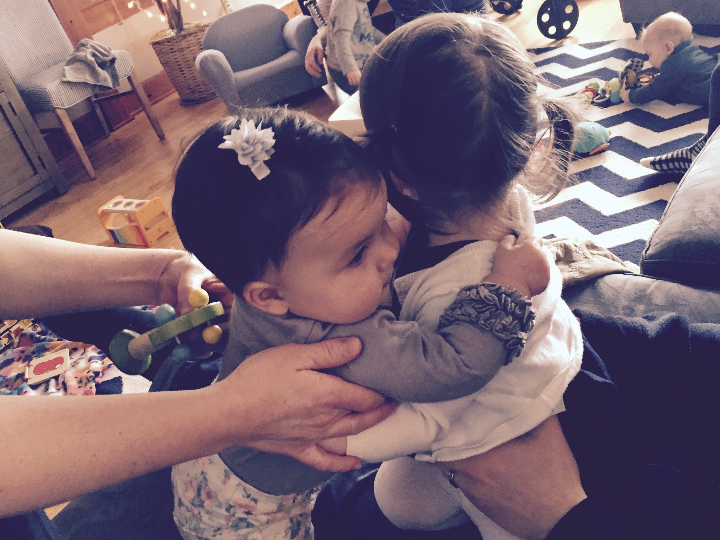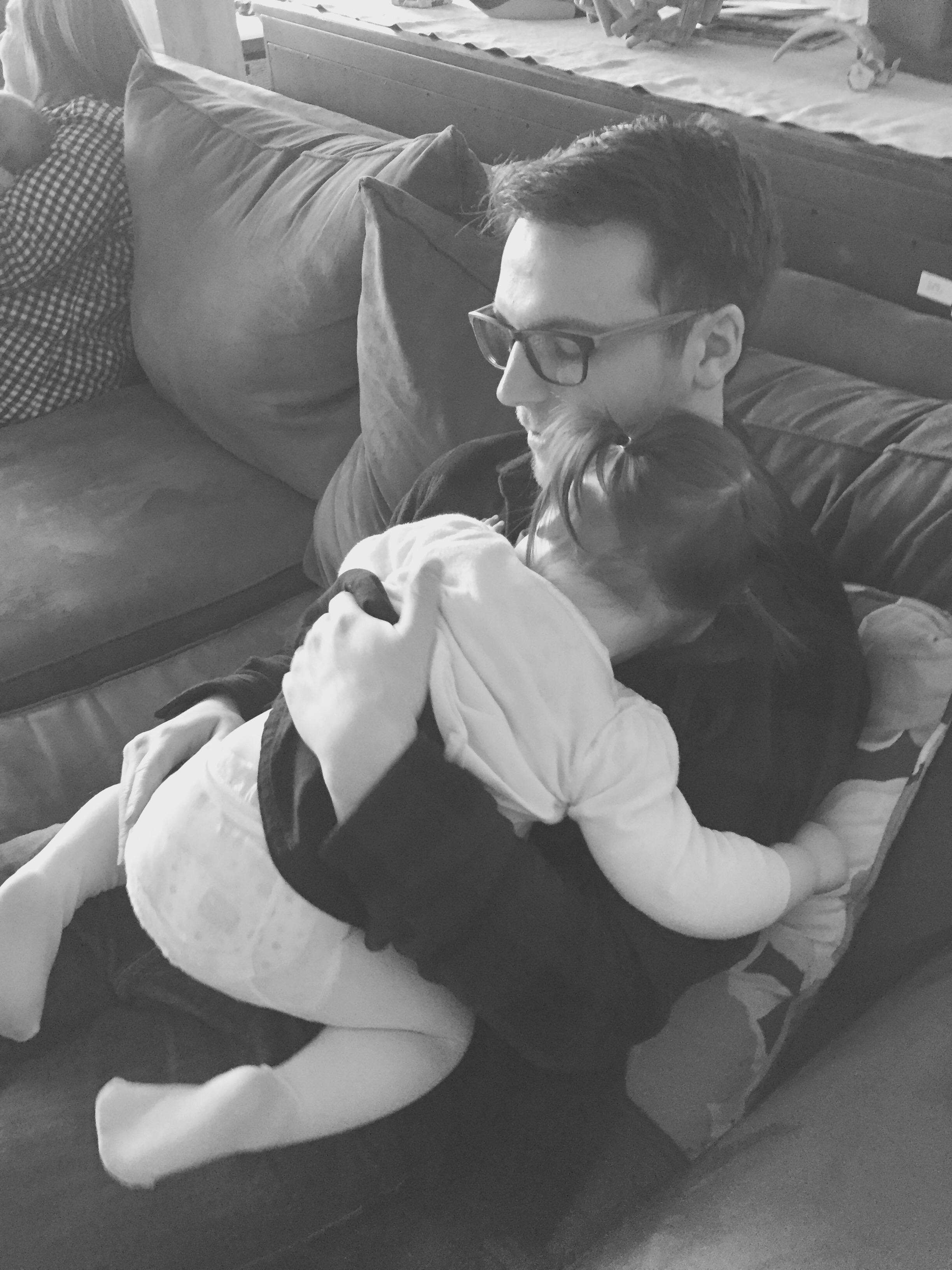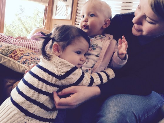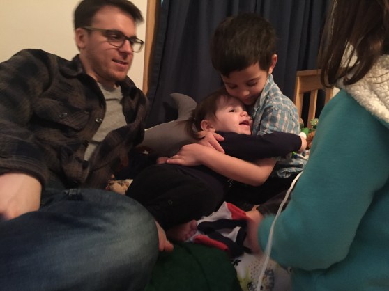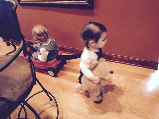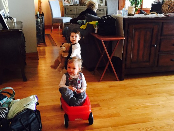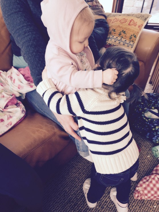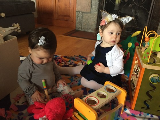 Anyway, the dad, Dave, was laying on the ground next to his 7 or 8 month old baby (who C was OBSESSED with) and Mark was laying on a spot on the floor across the room. In C’s wild, happy oblivion, she climbed up on top of Dave and gave him loving, happy pats as she said “Dada.” At first I responded with, “Yes, that’s Eli and Ari’s dada.”