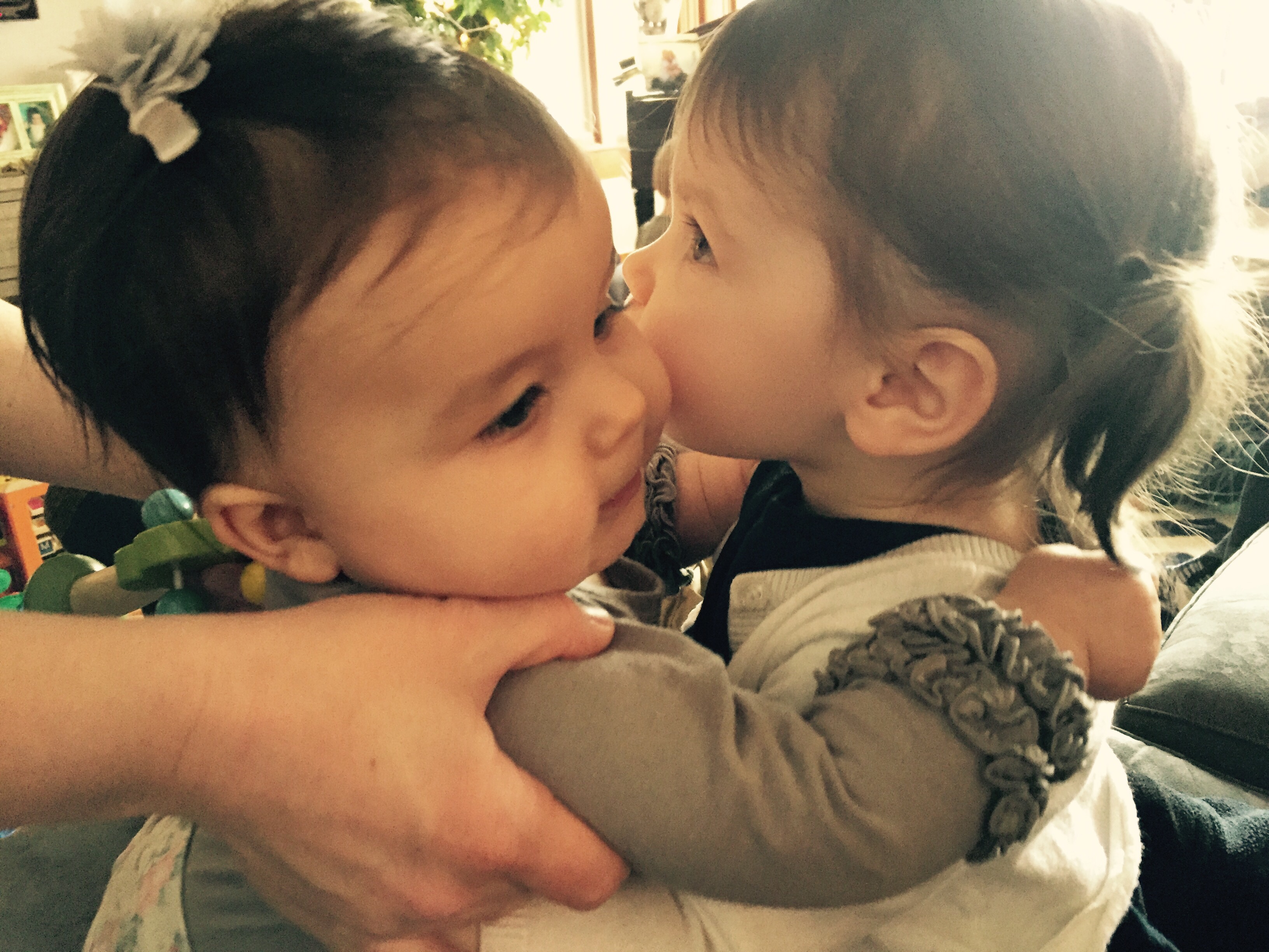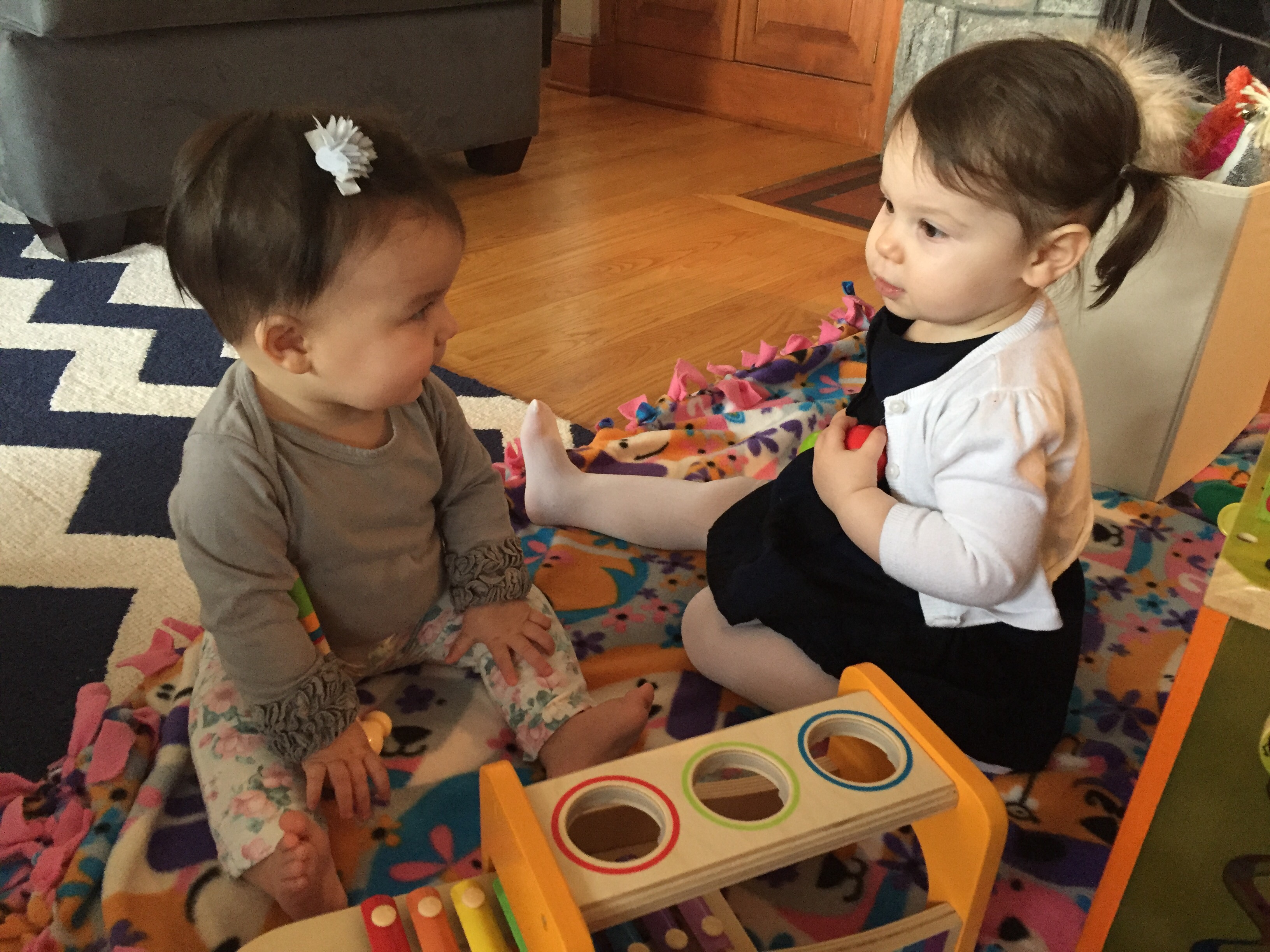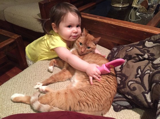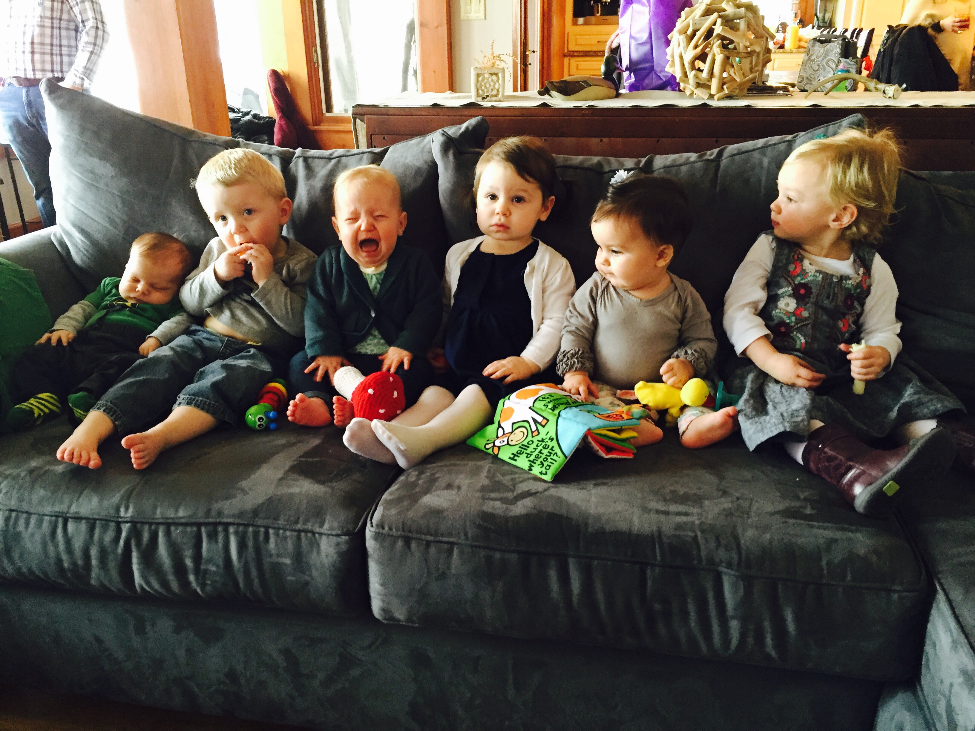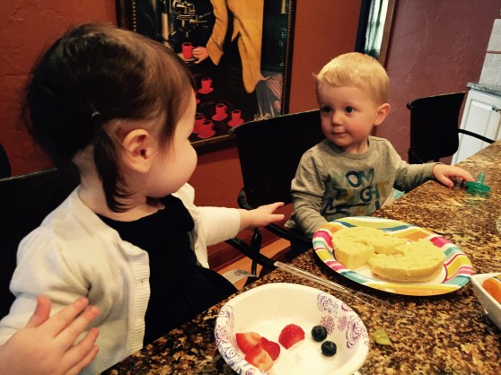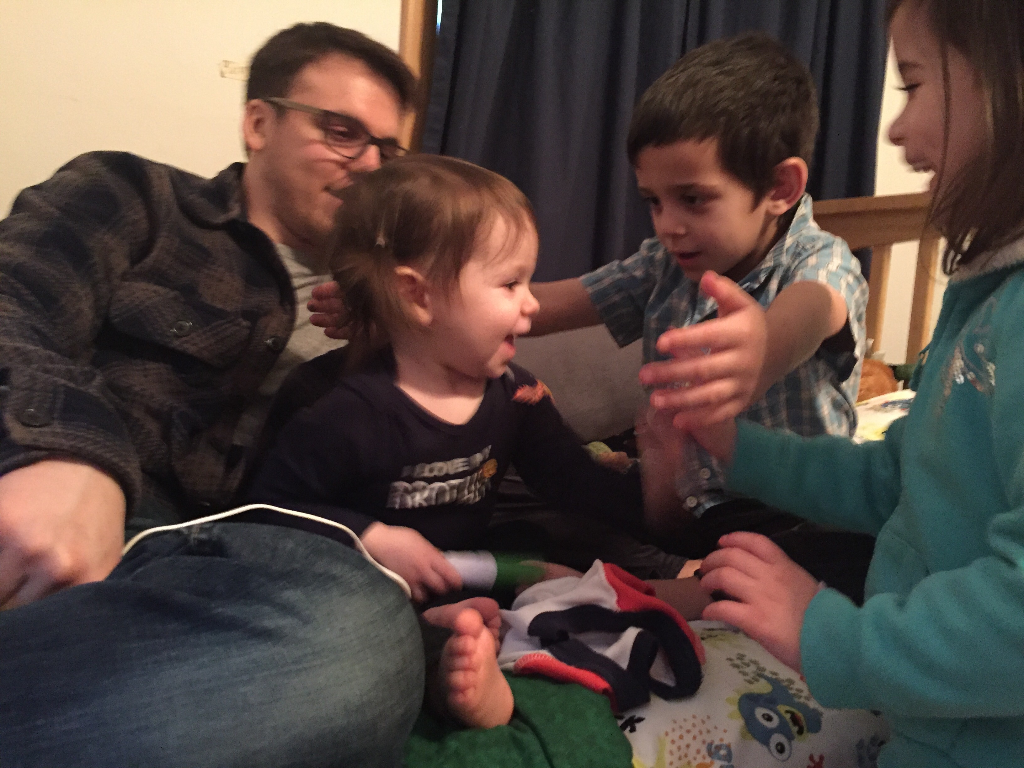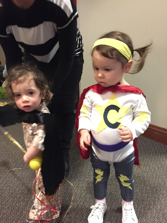 Anyway, the dad, Dave, was laying on the ground next to his 7 or 8 month old baby (who C was OBSESSED with) and Mark was laying on a spot on the floor across the room. In C’s wild, happy oblivion, she climbed up on top of Dave and gave him loving, happy pats as she said “Dada.” At first I responded with, “Yes, that’s Eli and Ari’s dada.”
