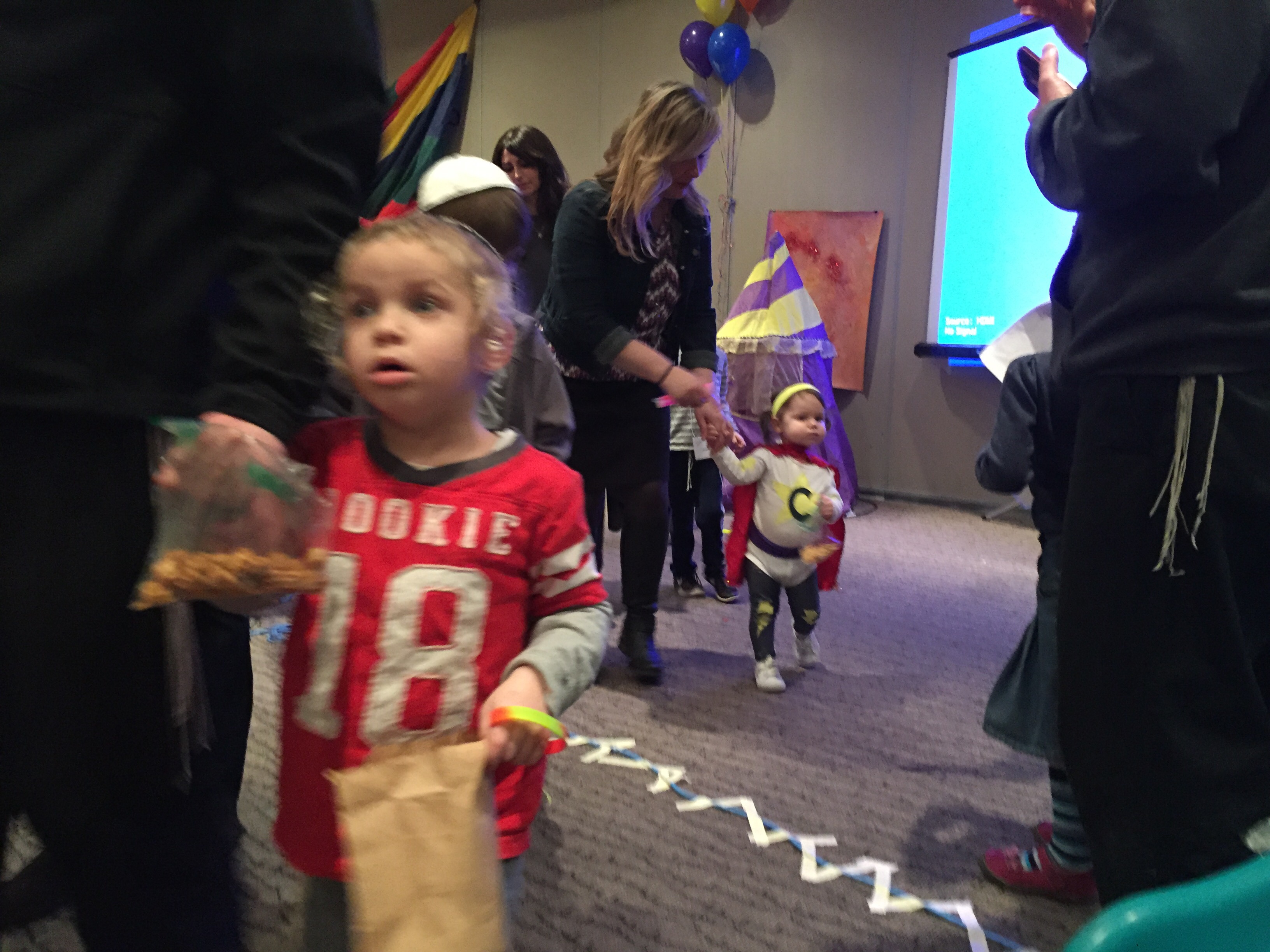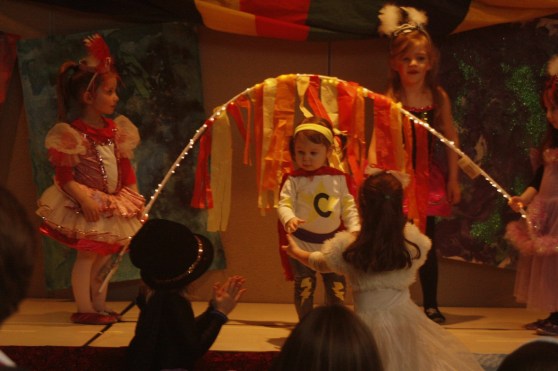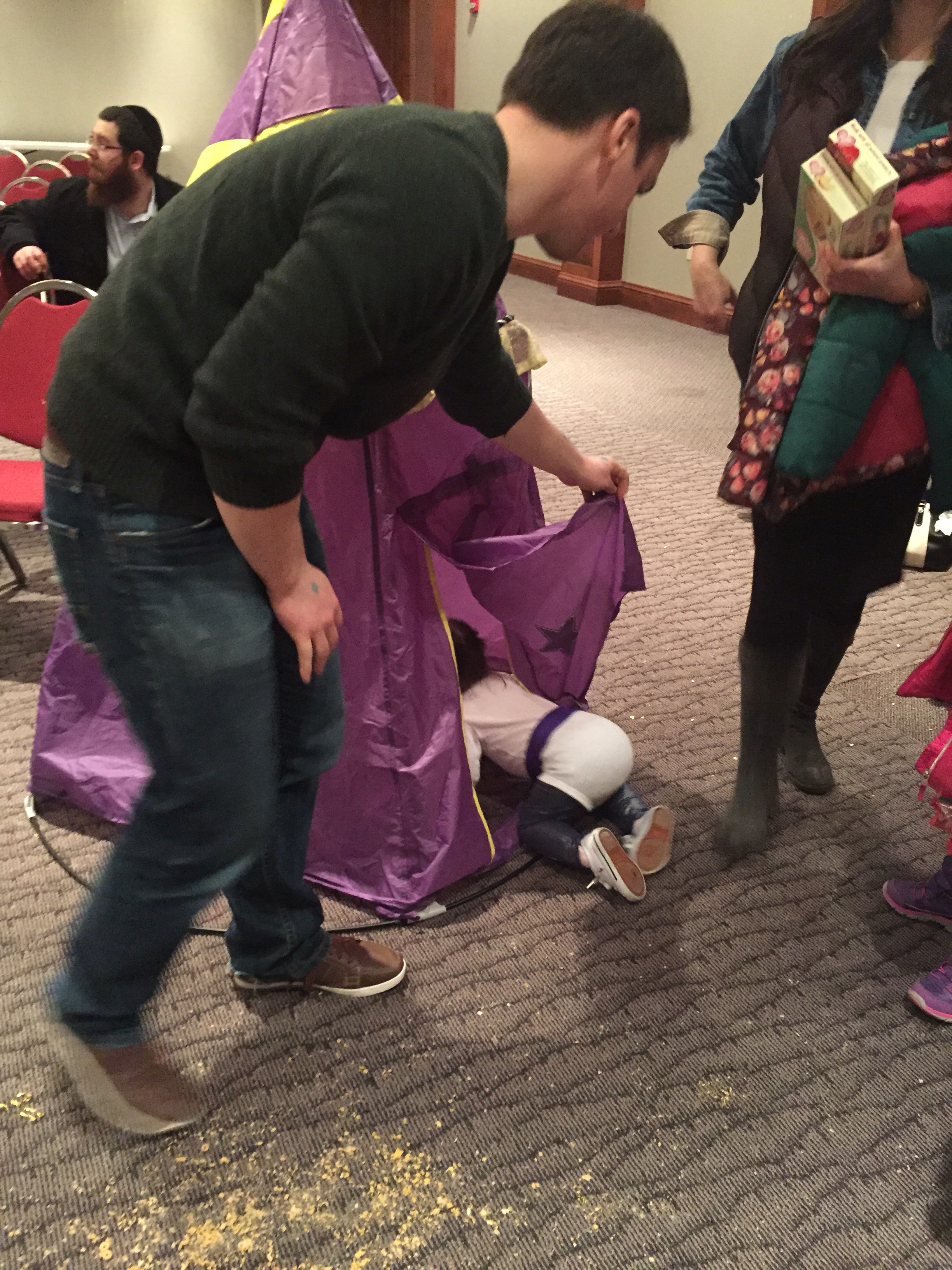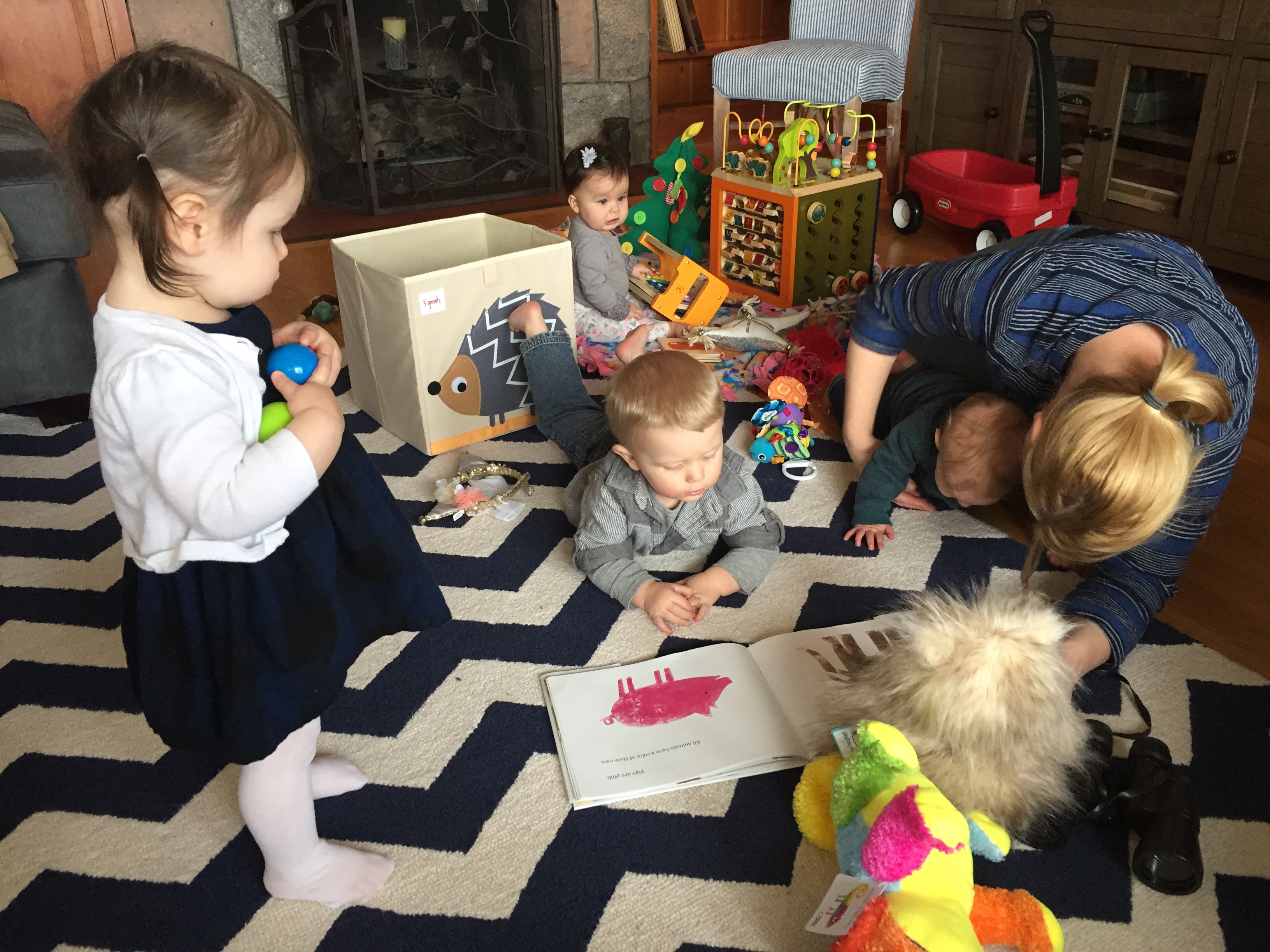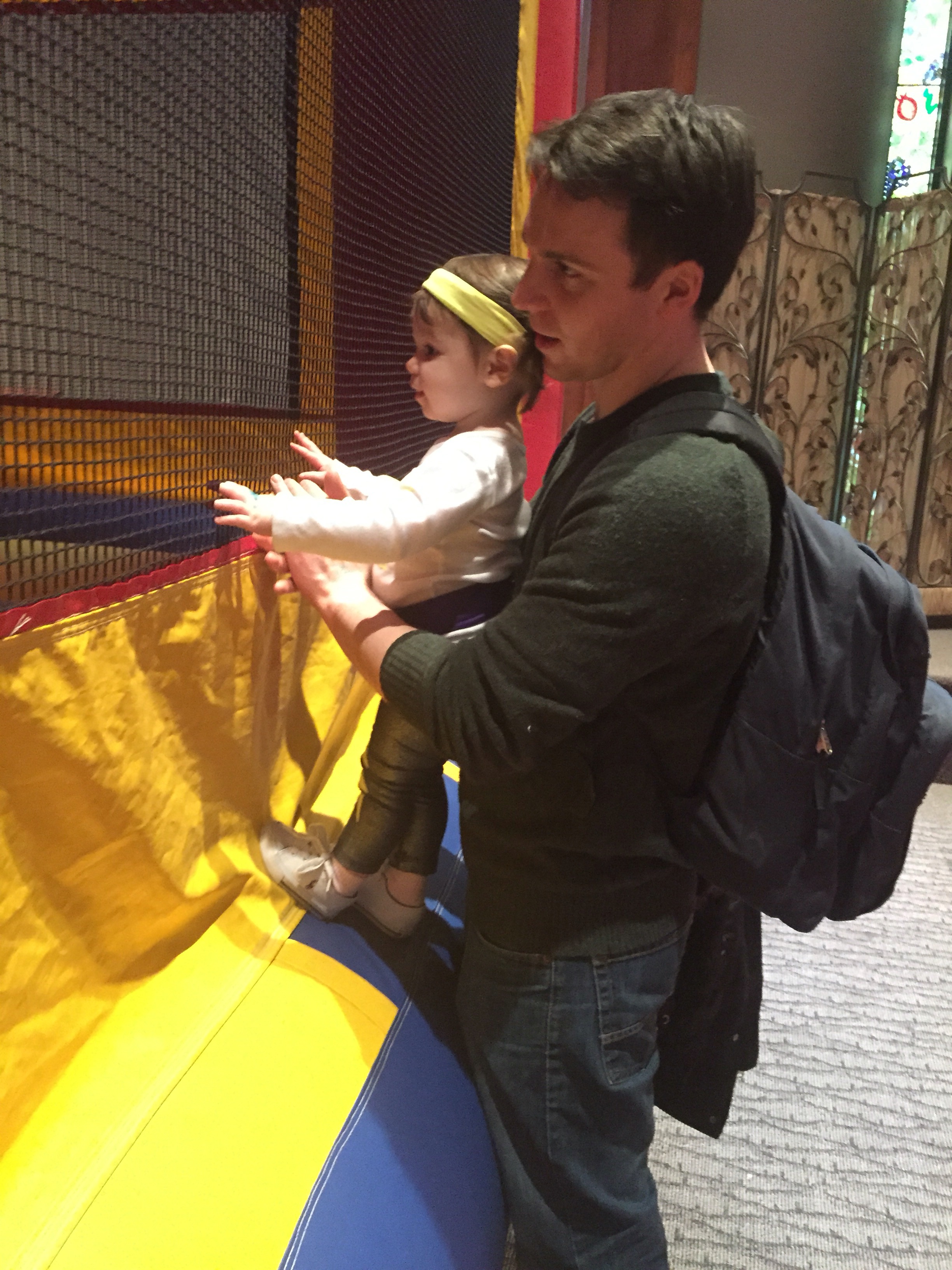 Anyway, the dad, Dave, was laying on the ground next to his 7 or 8 month old baby (who C was OBSESSED with) and Mark was laying on a spot on the floor across the room. In C’s wild, happy oblivion, she climbed up on top of Dave and gave him loving, happy pats as she said “Dada.” At first I responded with, “Yes, that’s Eli and Ari’s dada.”