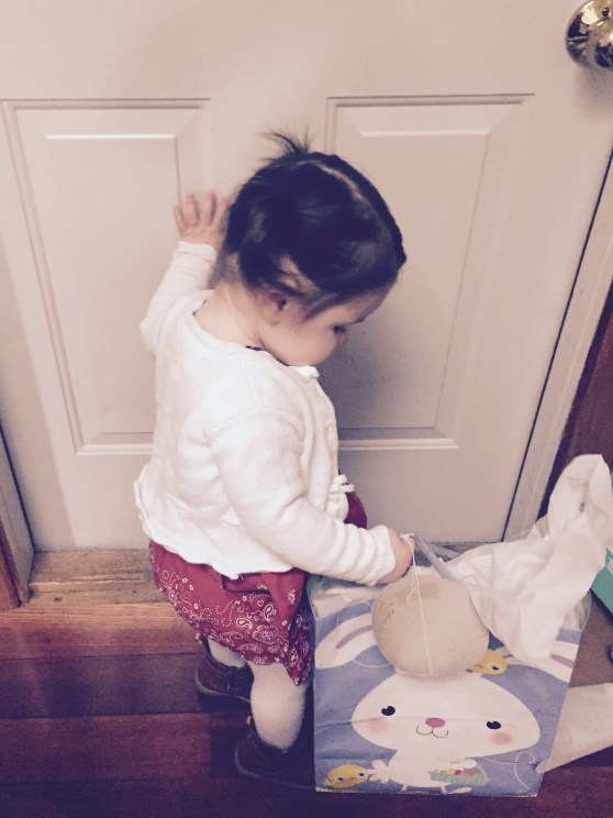 On Sunday, we went to Home Depot and Whole Foods in the morning. HD gave away little plastic easter eggs with wrapped chocolate bunnies inside. We’ve never given C chocolate, so we just let her play with the candies assuming she didn’t know what they were. Sure enough, when we looked down at her, she was silently indulging in some chocolate. We let her take one more bite and then called it quits on the chocolate.