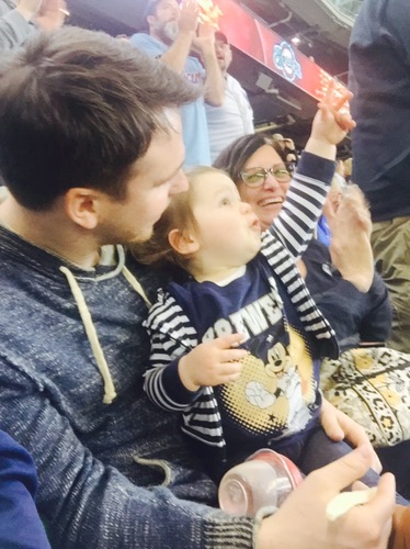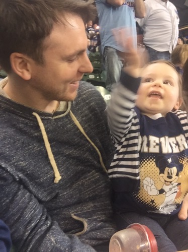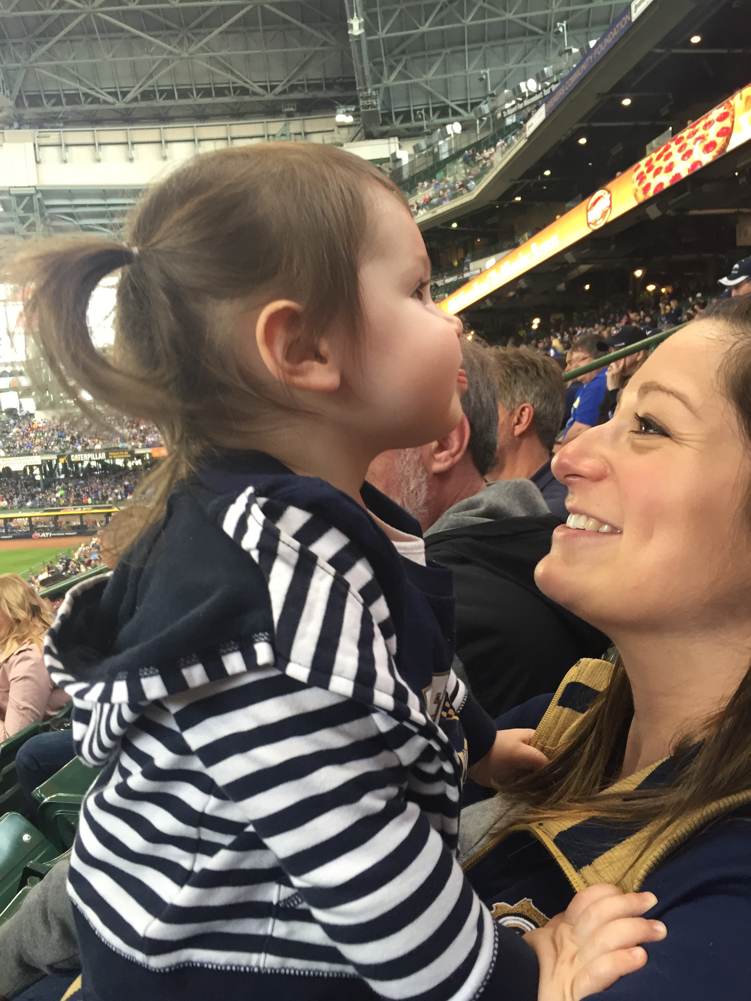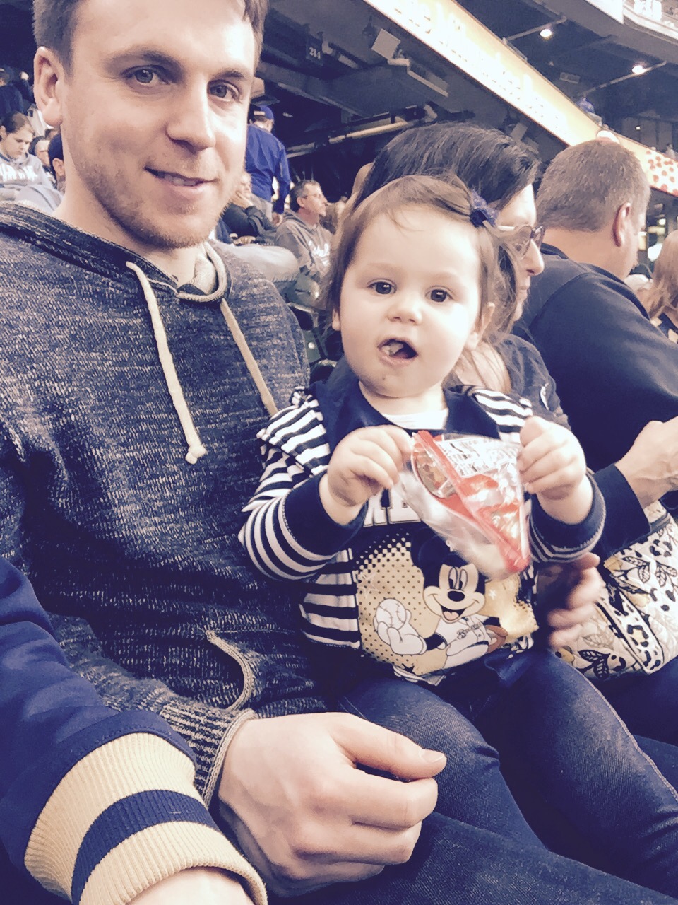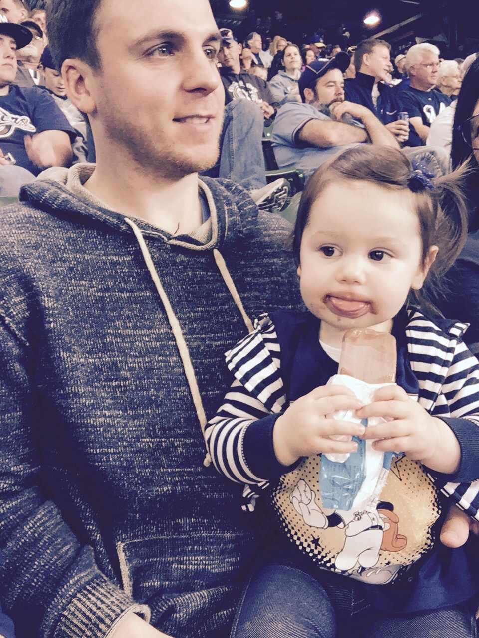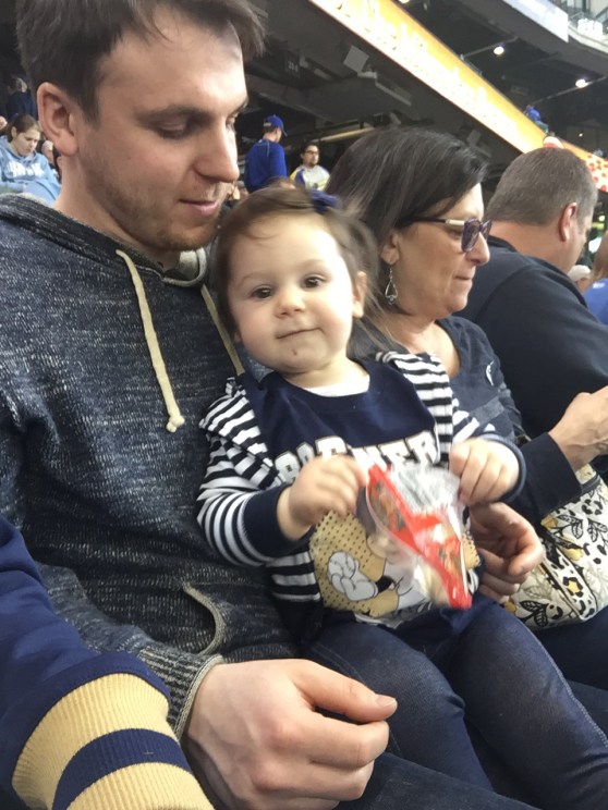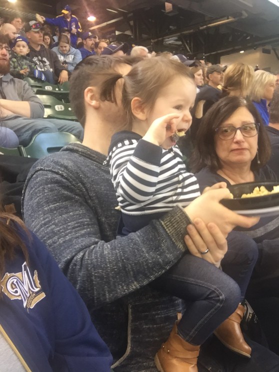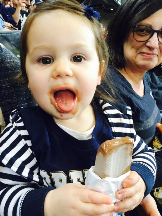 I was really proud… She “did baseball” perfectly. From the moment we arrived to the moment we left, she was eating! Grandma brought her some Annie’s shells and cheese (she took down at least half a box), then she ate a full peach, and apple slices. After that, she got a free fudge bar from the stadium (kid’s day!).