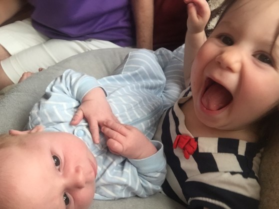 He also seems to be entertained by his sister… Or comforted or something. Despite the fact that she appears to be all over him and shoving paci’s in his mouth or just “loving him too hard”… He seems to be at peace with her… Until he isn’t! Haha I mean, let’s be honest, there are only so many 26 lb hugs an infant can take before he’s had enough.