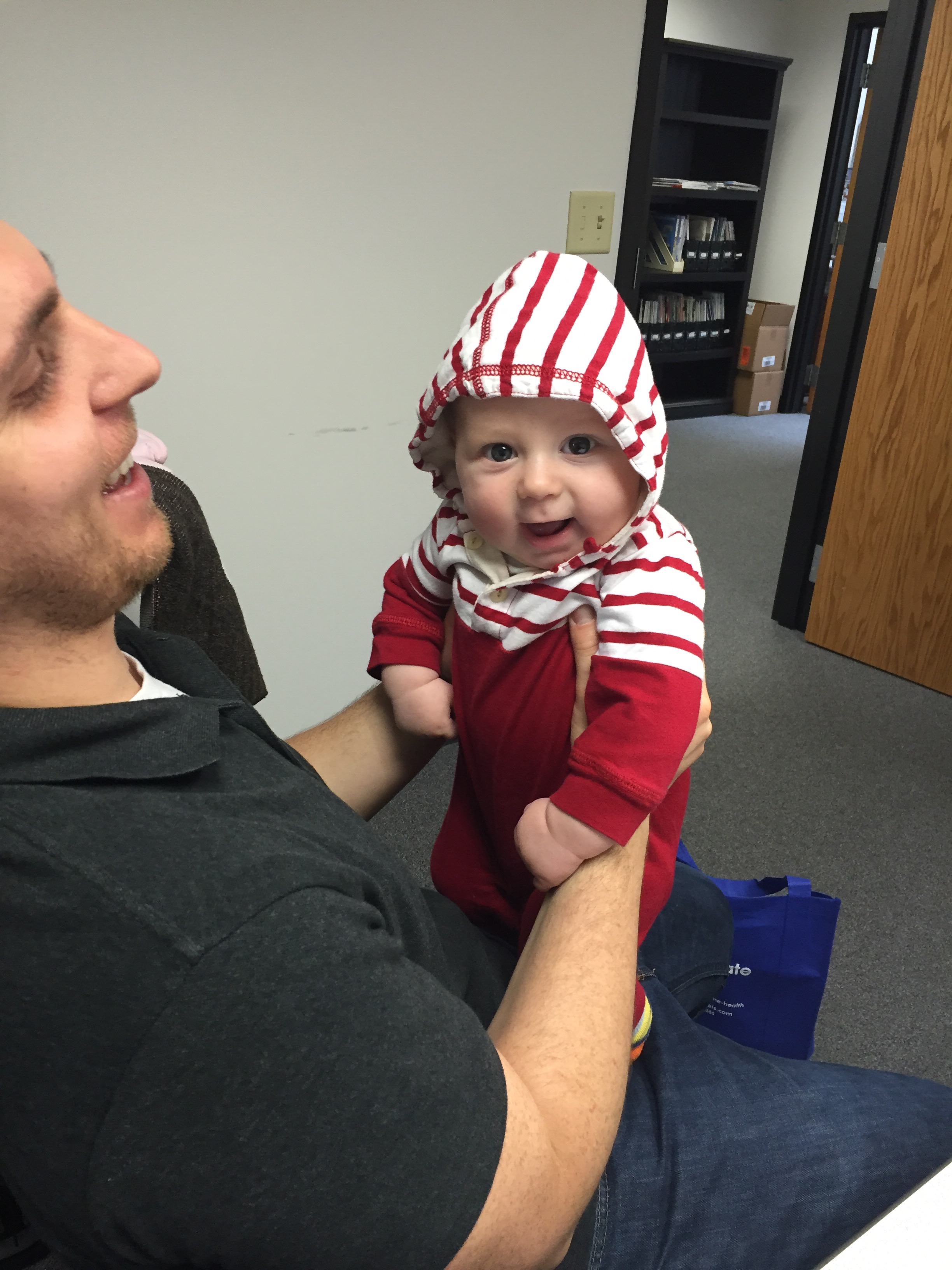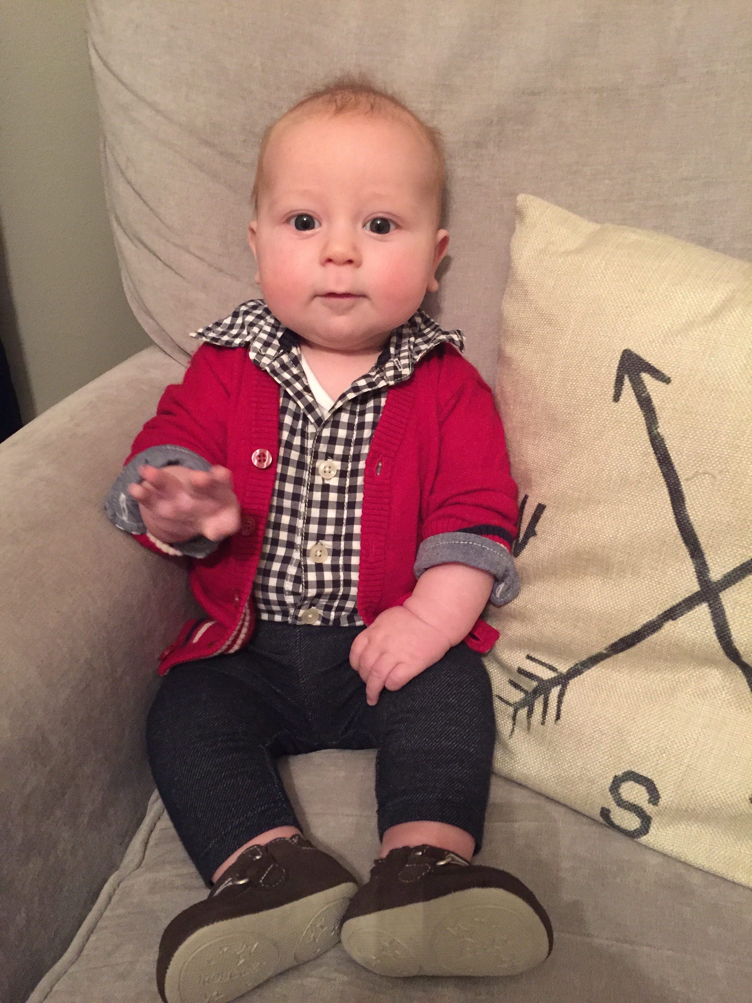 When we took him to the doc last week (for shots), he weighed in at almost 17 lbs (with clothes). Can you believe?