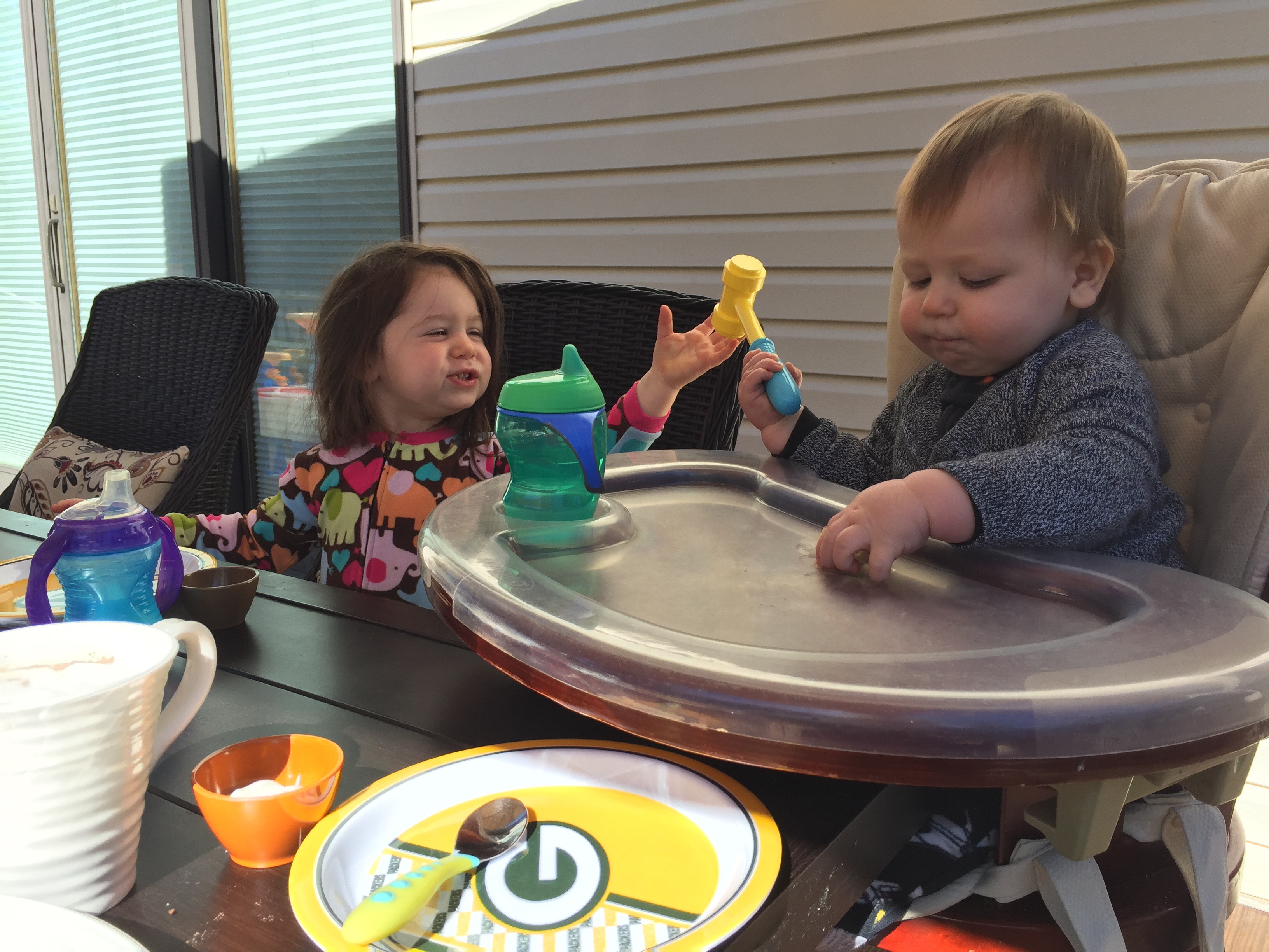 These are the moments. H kept his mallet in his hand as he took down 2.5 pancakes and C entertained us with her priceless chatter.