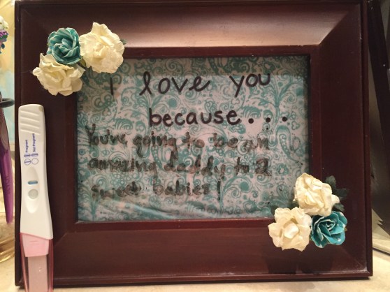 I duplicated my message to hubs from last time, but instead of putting the announcement sign near the toilet (which didn’t work as planned last time), I put it near the toothbrushes. After reaching over the sign and pregnancy test three times, he finally saw the message and ran out of the bathroom with a full face of toothpaste and half screamed, “REALLY?!” with a big sudsy smile!