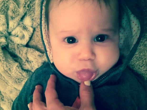 Beyond that, I believe she is working on more teeth… it could be the molars on her right side (she has the top and bottom on the left) or it could be some other set of teeth. Either way, the intense amounts of drool and jamming her fingers in her mouth (and down her throat) leads me to believe that teething is playing a role.
