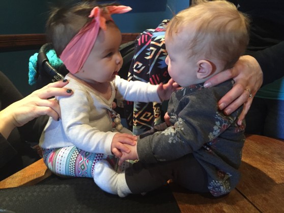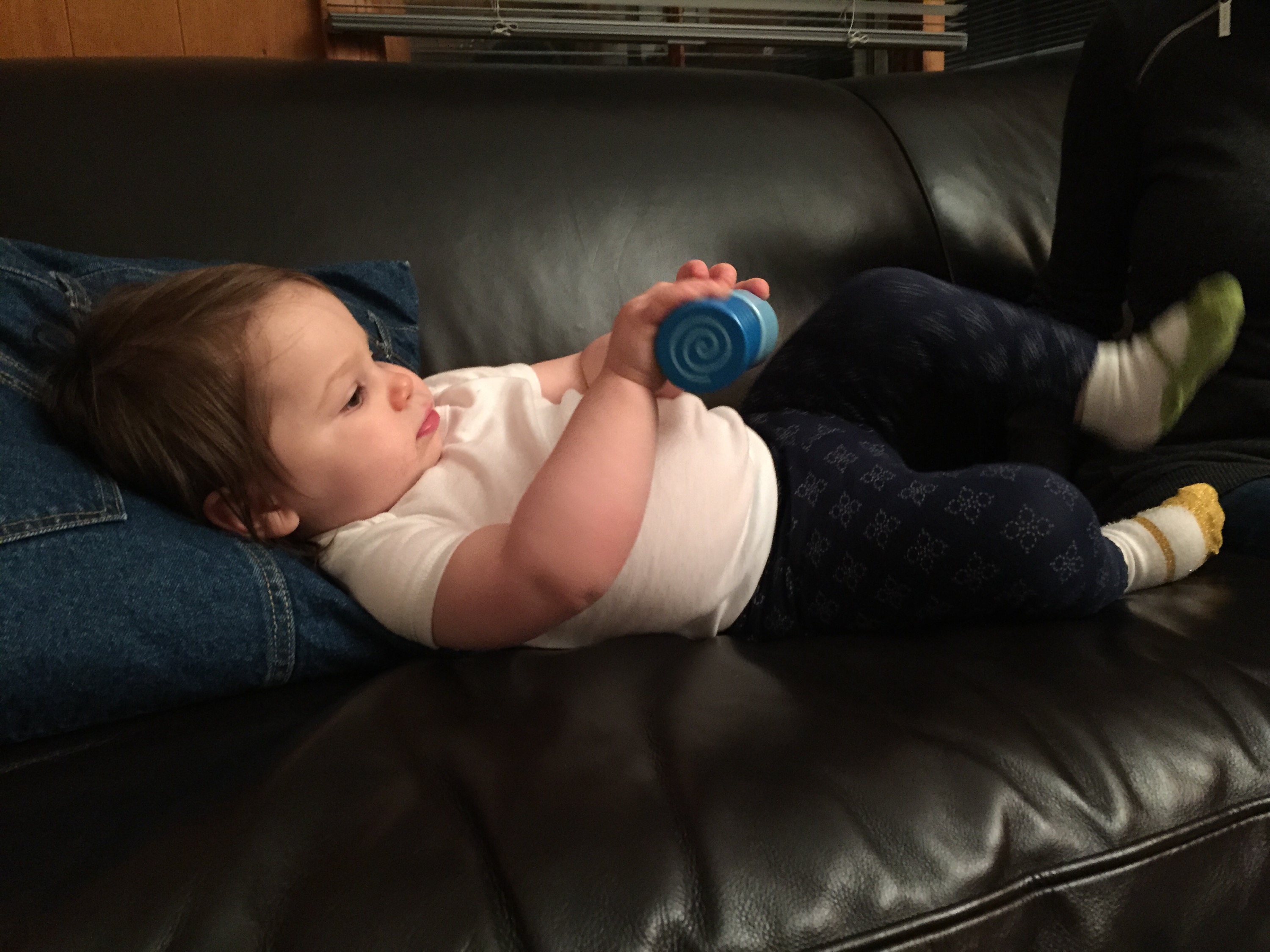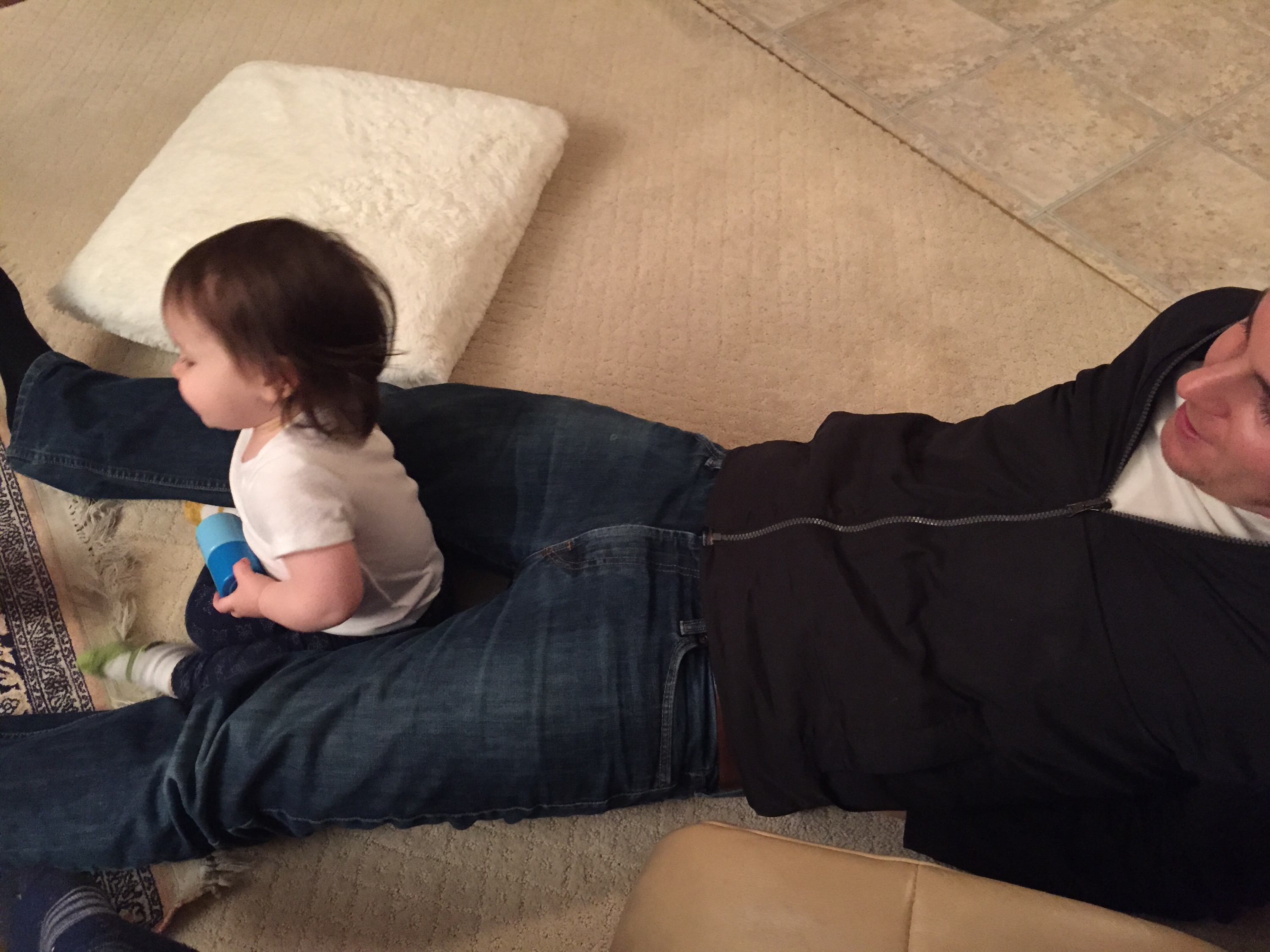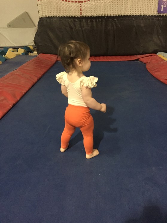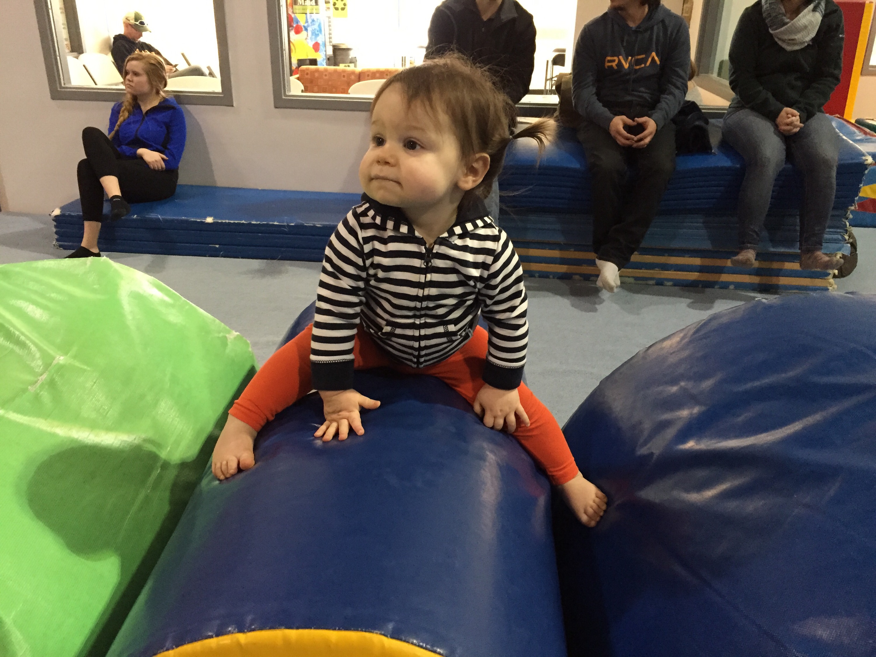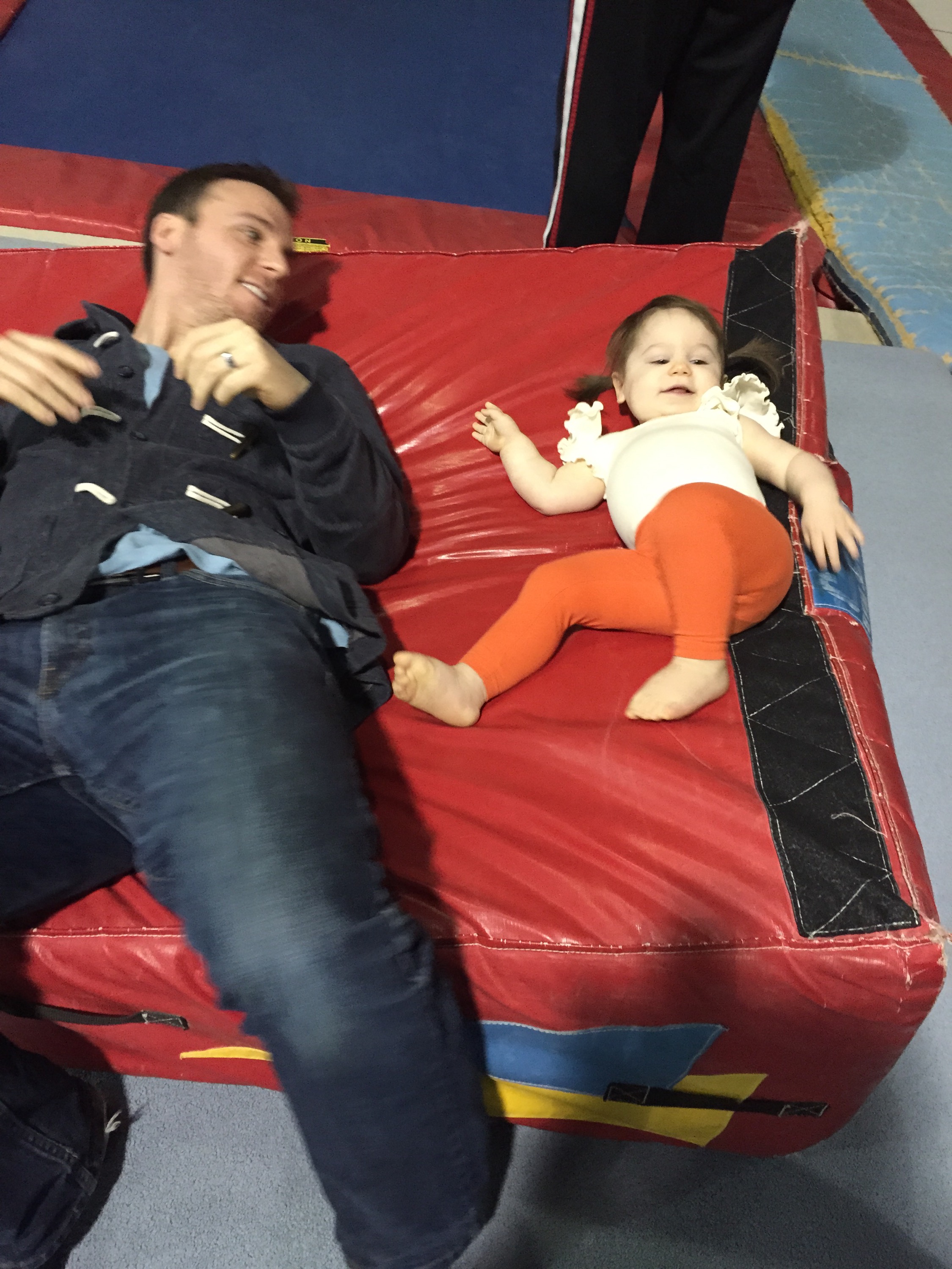 Charlotte was a bit overwhelmed at class, but after getting some good bouncing in on the trampoline, she lightened up (her grip… she was a clingy koala for most of class). And of course, in her sudden, post-jump excitement, she started running towards all the people and stepped right off of the mats and faceplanted on the only foot of hard surface in the dang place.