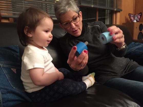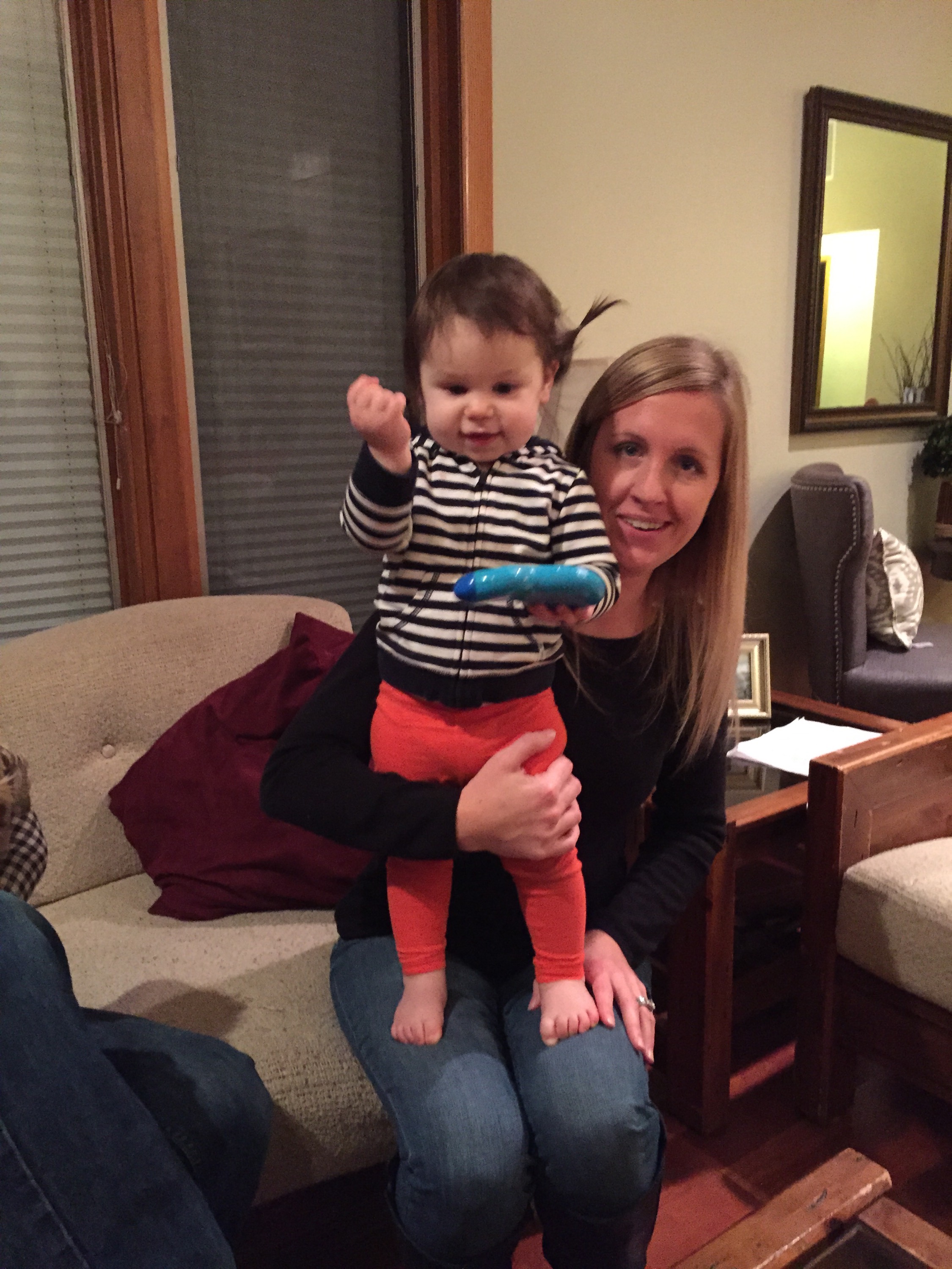 Finally, after Charlotte’s nap, it was time to go to Grammy & Grampie’s for the first night of Chanukah. And let me just say, Charlotte had a blast. We didn’t have a booster seat, so we sat her on top of a couple medical books and strapped her in with a belt. It worked perfectly and she loved sitting at the table like a big girl.
