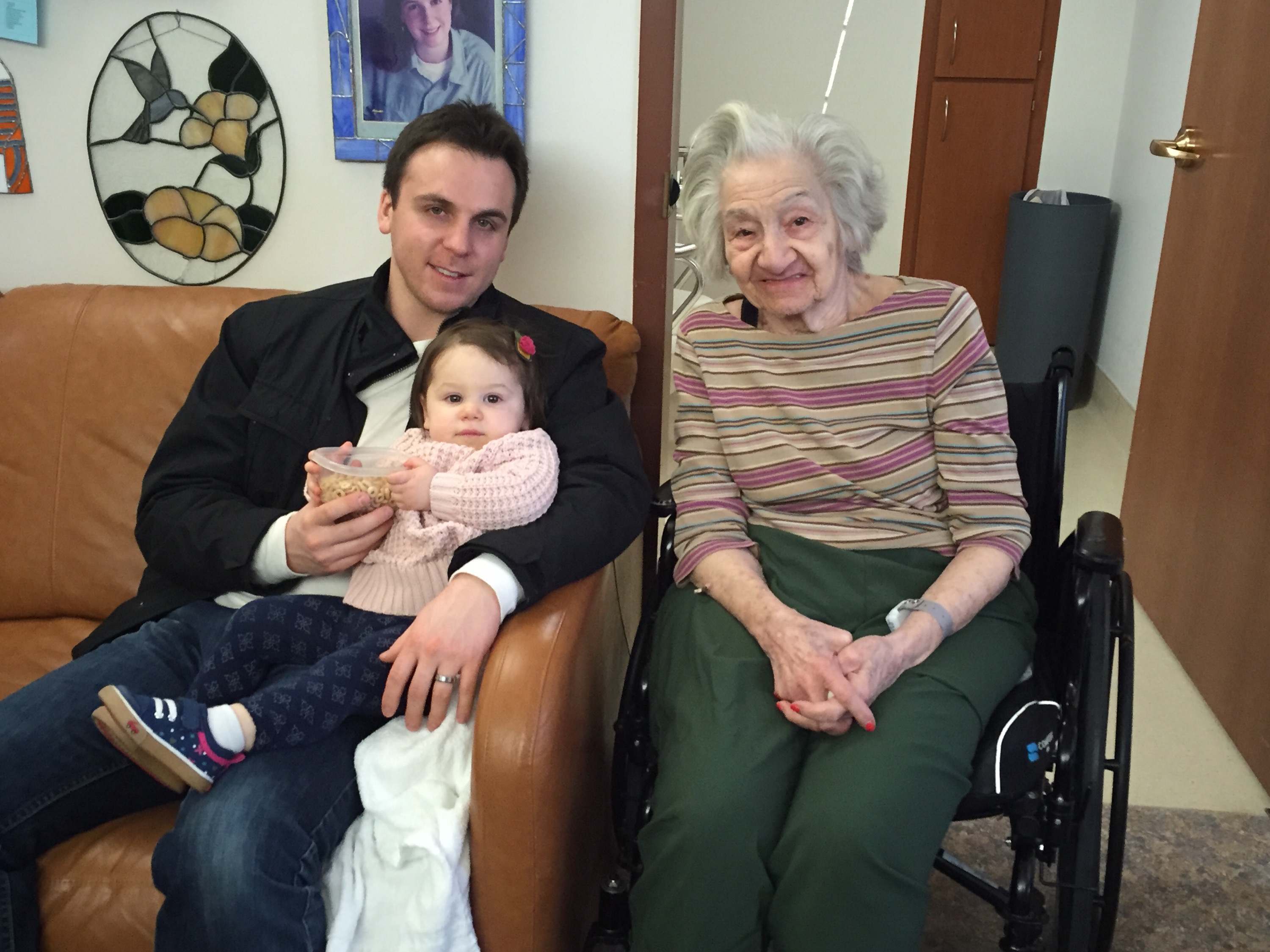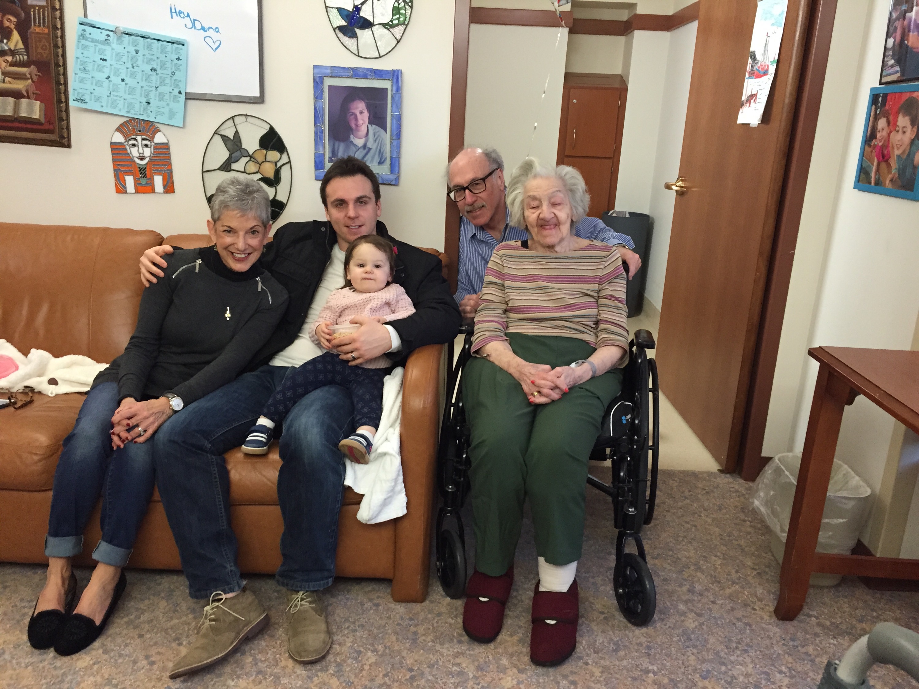 Then on Sunday, we headed to the nursing home to wish Mark’s grandmother a happy 97th birthday! Charlotte was a bit overwhelmed by the home. She wasn’t super comfortable, but did manage to give Grandma Dina a couple birthday smooches.